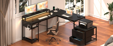 66" L Shaped Desk with Wood Drawers, 113" 2-Person Desk with Printer Stand, Power Outlet, Brown