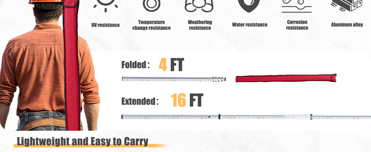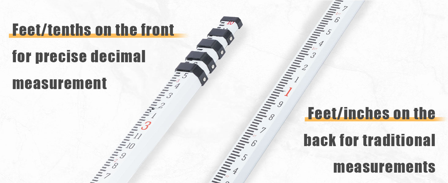 - Clear Markings: This rod has markings on both sides—feet/10ths on the front and feet/inches on the back (the back measures from top to bottom, so flip it before using). The scales are weatherproof, corrosion-resistant, and feature bright red indicators for easy and accurate reading.