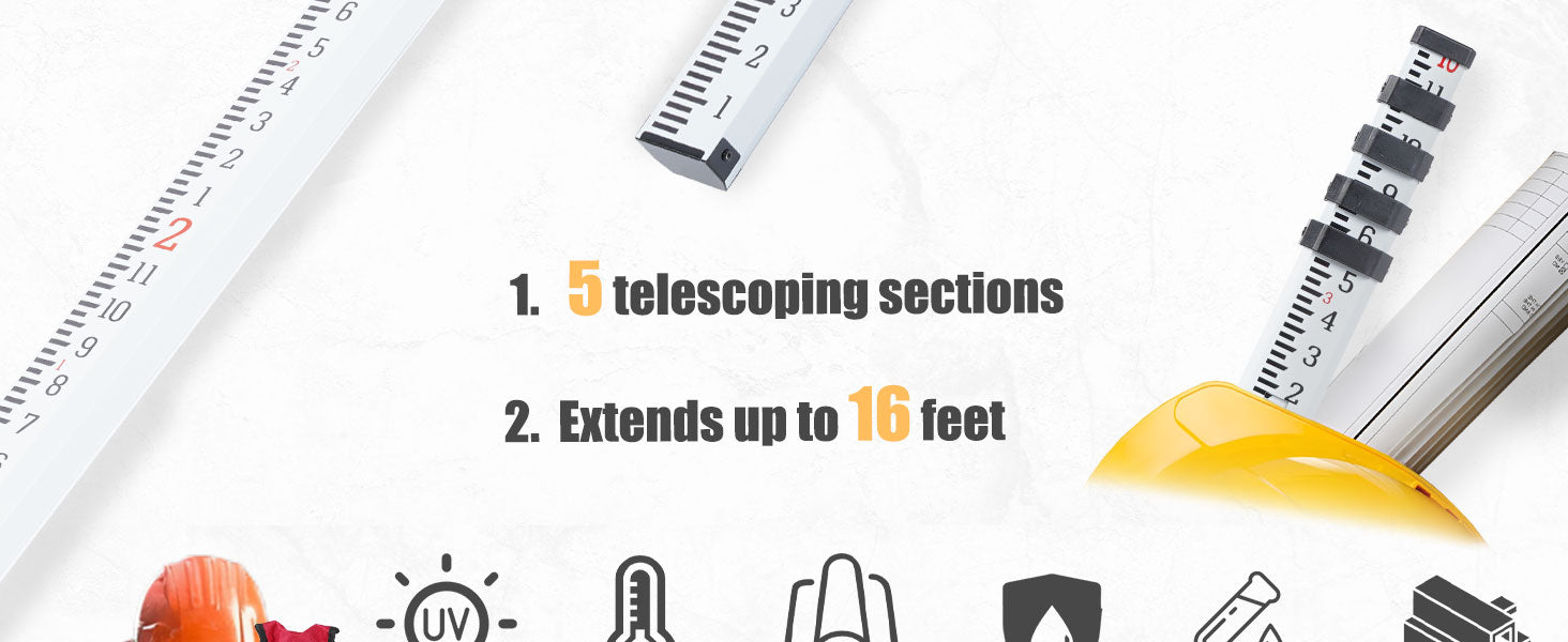 16Ft Telescopic Grade Rod, 5-Section Aluminum Survey Stick with 1/10in Scale, Bubble Level & Bag