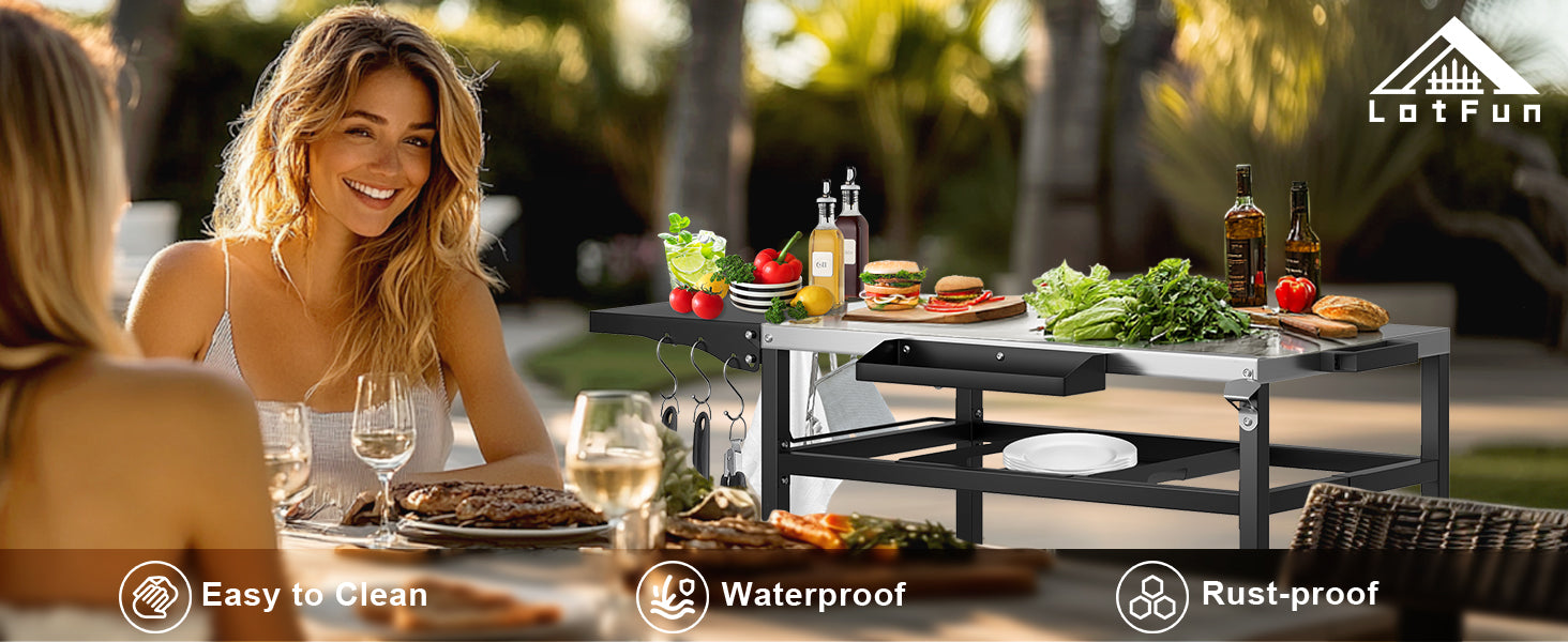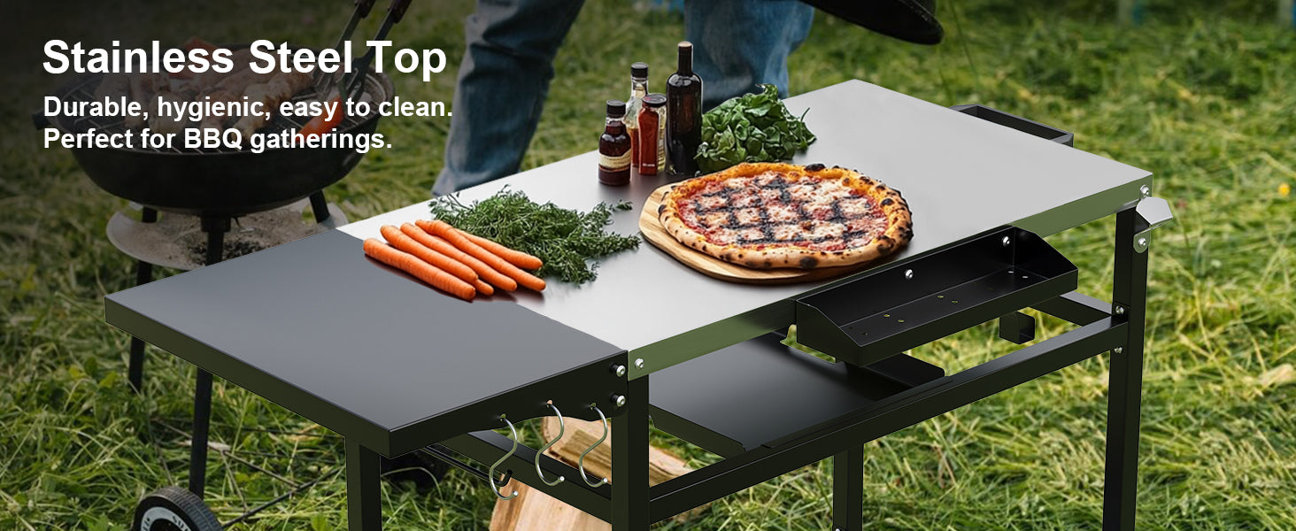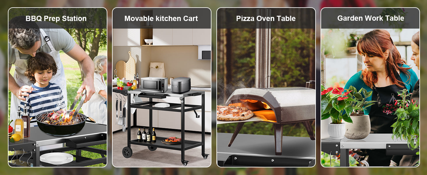 - MULTI-FUNCTIONALITY: This multi-functional device is not just a grill cart, but also doubles as an outdoor bar, preparation table, mobile kitchen island, etc. The movable workbench can be used on the patio, garden, kitchen. It will be a great addition to your home