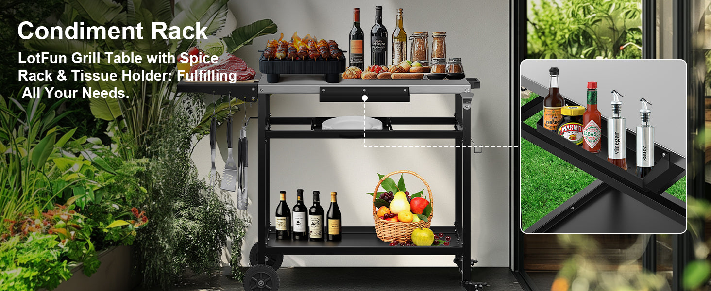 - 3-TIER STORAGE SPACE: LotFun grill cart can accommodate all kinds of ingredients without making you feel crowded. In addition, the cart also has 2 other storage shelves for your fruits, spices and utensils. The middle shelf is movable and detachable, and can be adjusted according to different usage scenarios