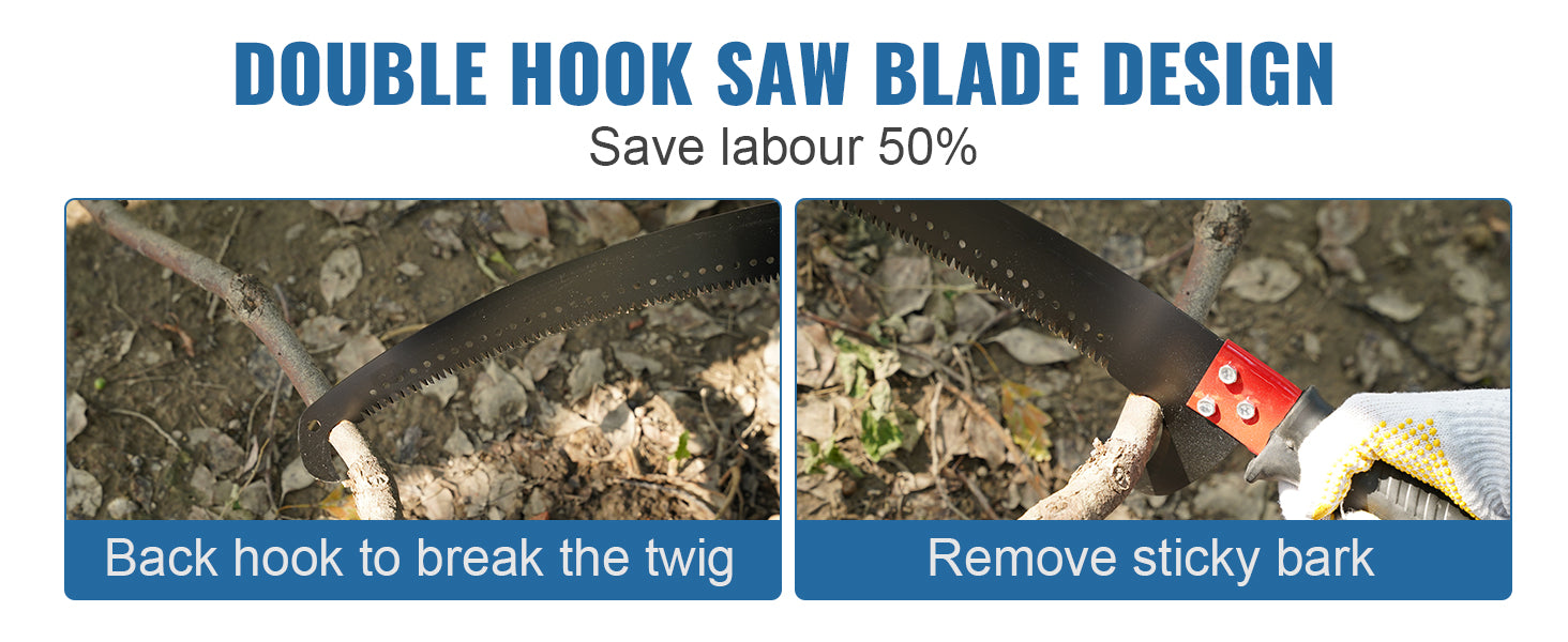 - Double Hook Saw Design: it adopts double hook design, the upper hook knife can break the thin twigs, the bottom hook saw can remove the connected twig, which can saw off 10cm twigs