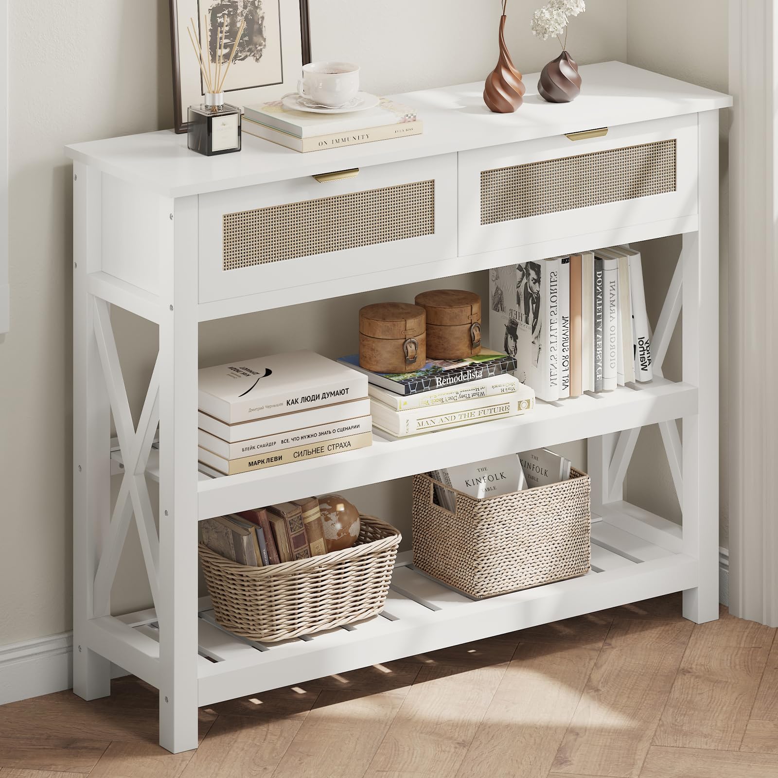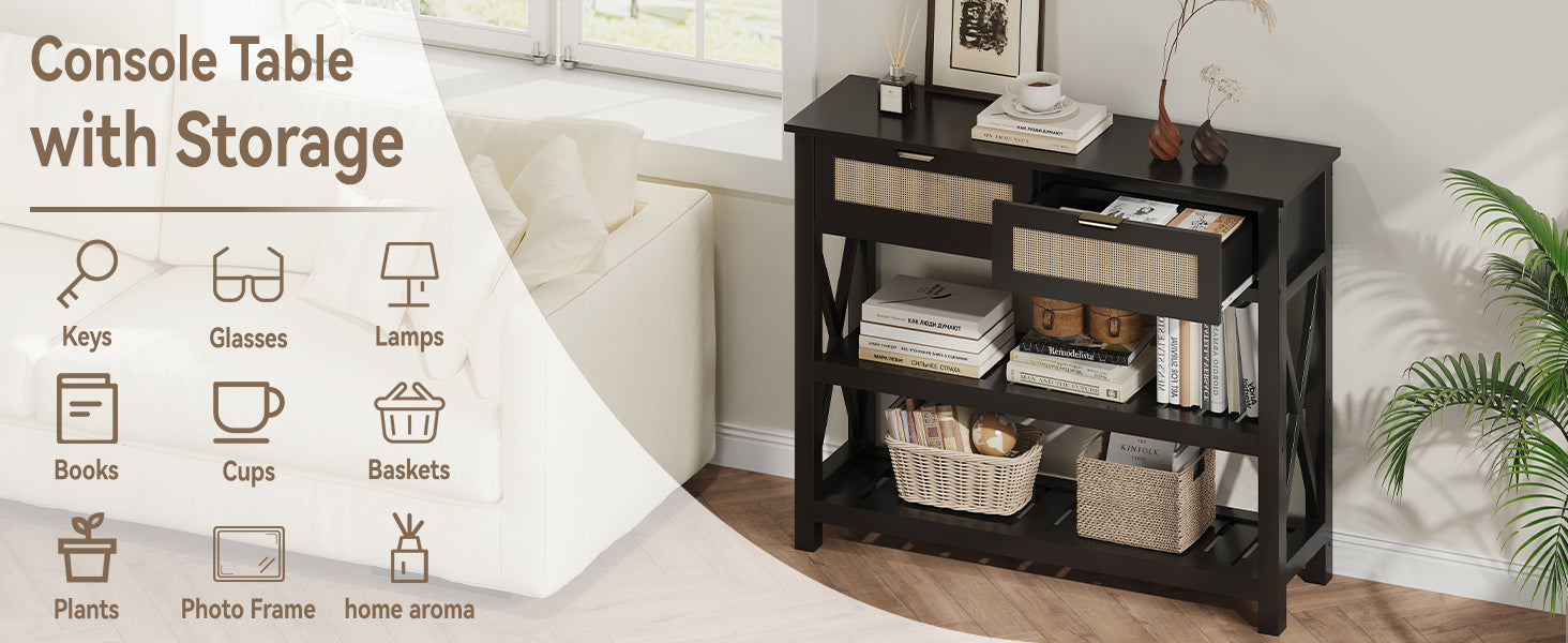 - Console Table with Storage: This practical console table for entryway has 3 rattan drawers and 3-tier storage shelves that cater to diverse needs; Measuring 47.2(L) x 11.8(W) x 31.5(H) inches, this narrow long entryway table with drawers is perfect for planters, photo frames, books, scented candles, boxes, baskets, and other items
