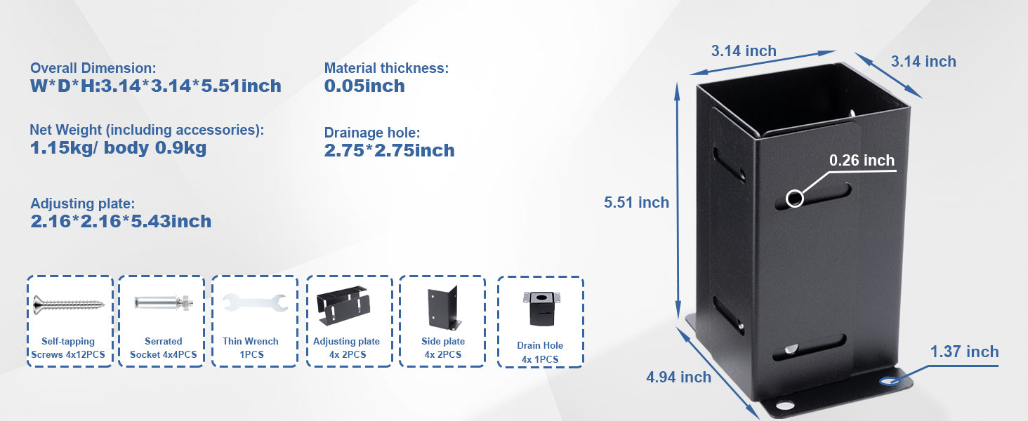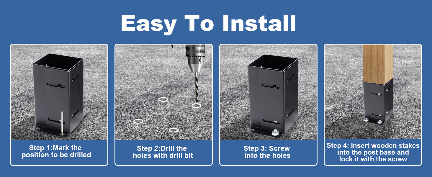 - Complete Hardware Kit for Easy Installation No need for additional tools—our kit includes screws, expansion bolts, washers, and even a wrench for effortless installation. Simply align the base, secure it with the provided hardware, and insert your wooden post—it's that easy!