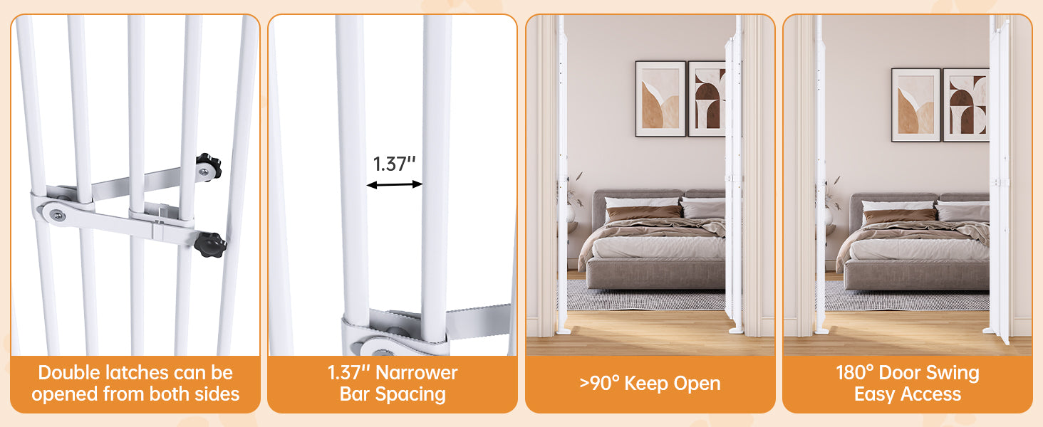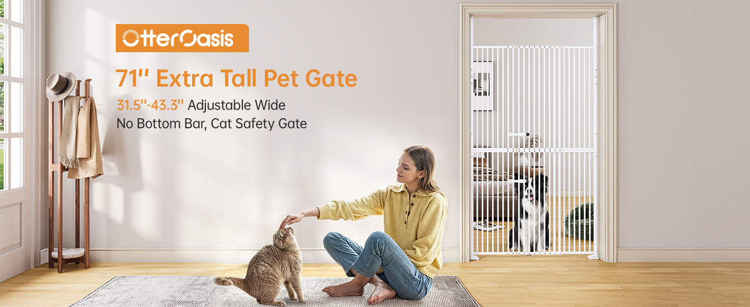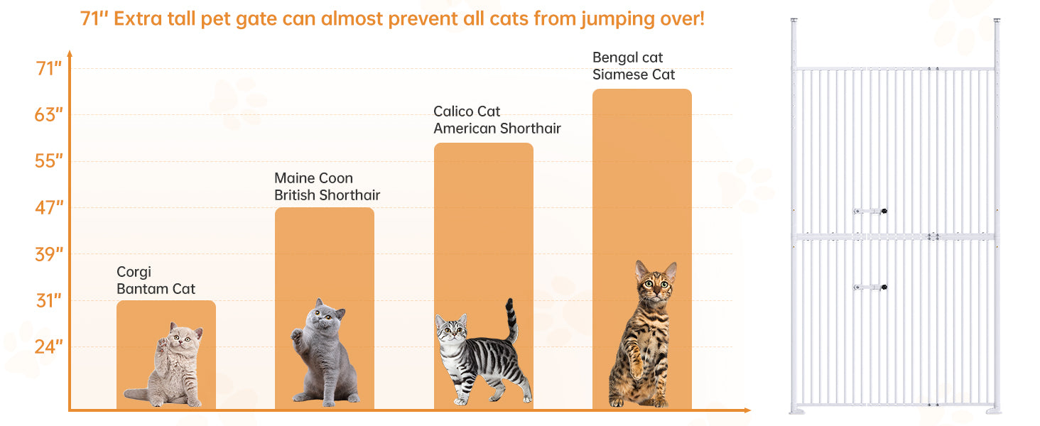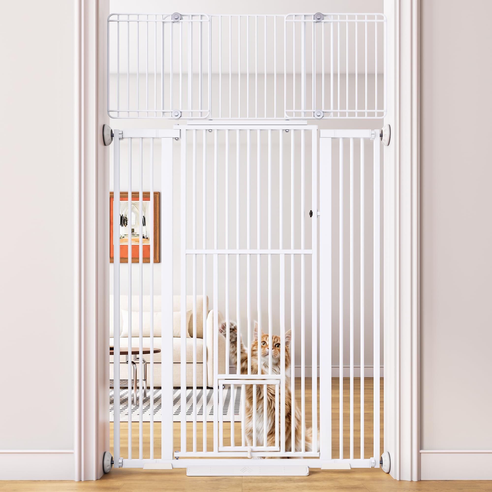 55.1'' Extra Tall Pet Gate for Cat, 29.5-43'' Extra Wide Cat Gate for Doorway with Upgraded Cat Door and 1.37'' Narrower Bar Spacing, NO Drilling Pressure Mounted Dog Gate Indoor