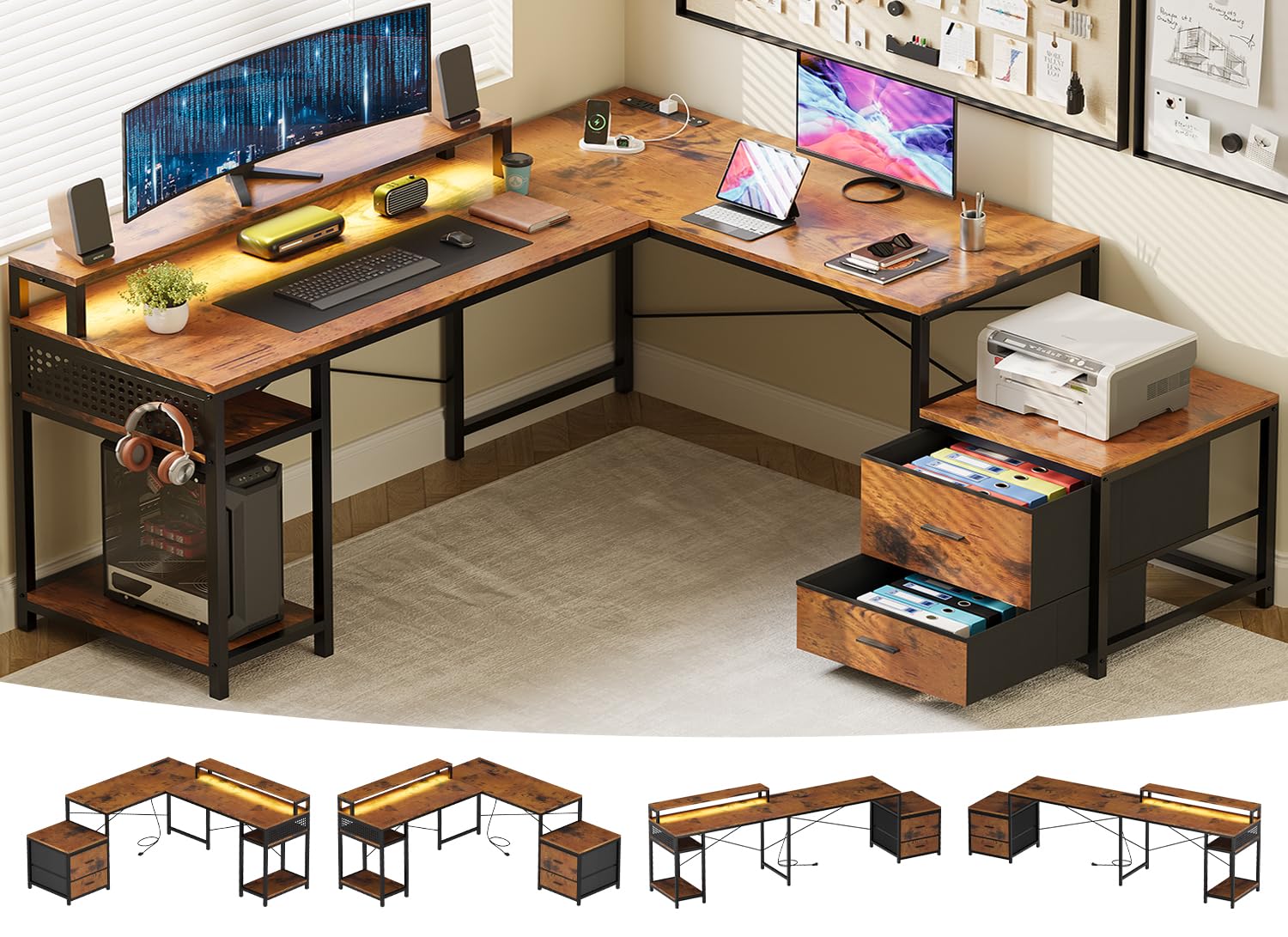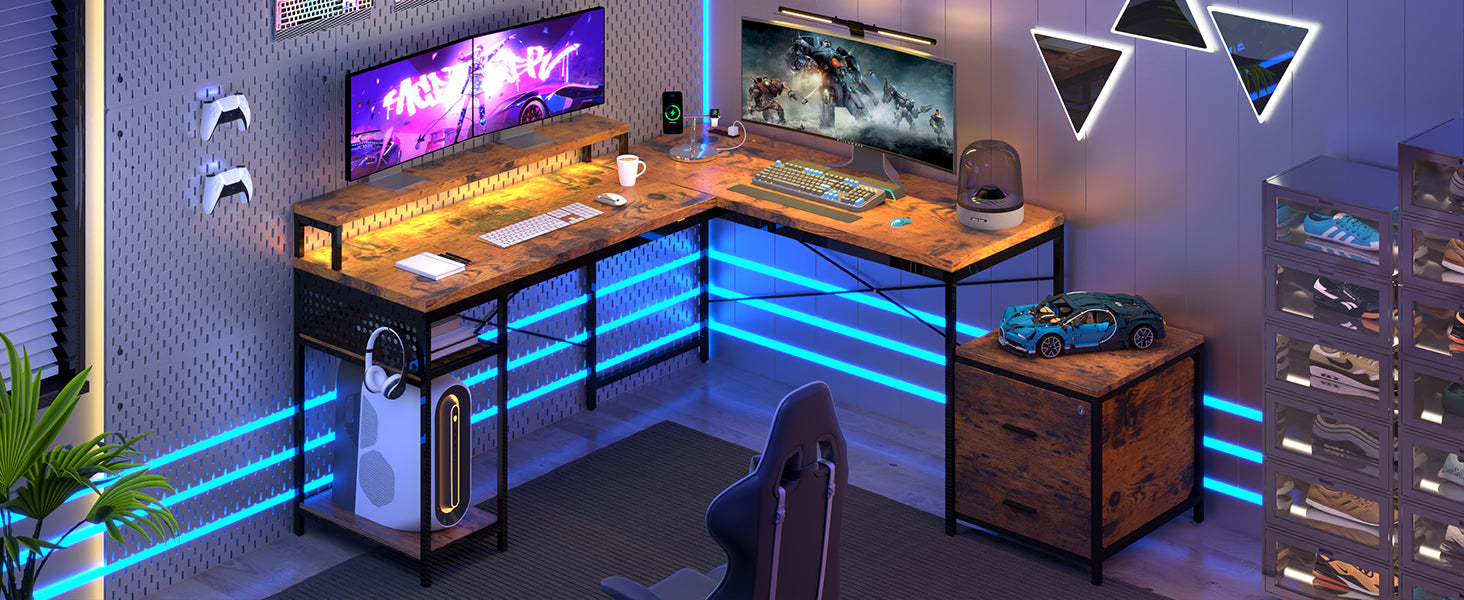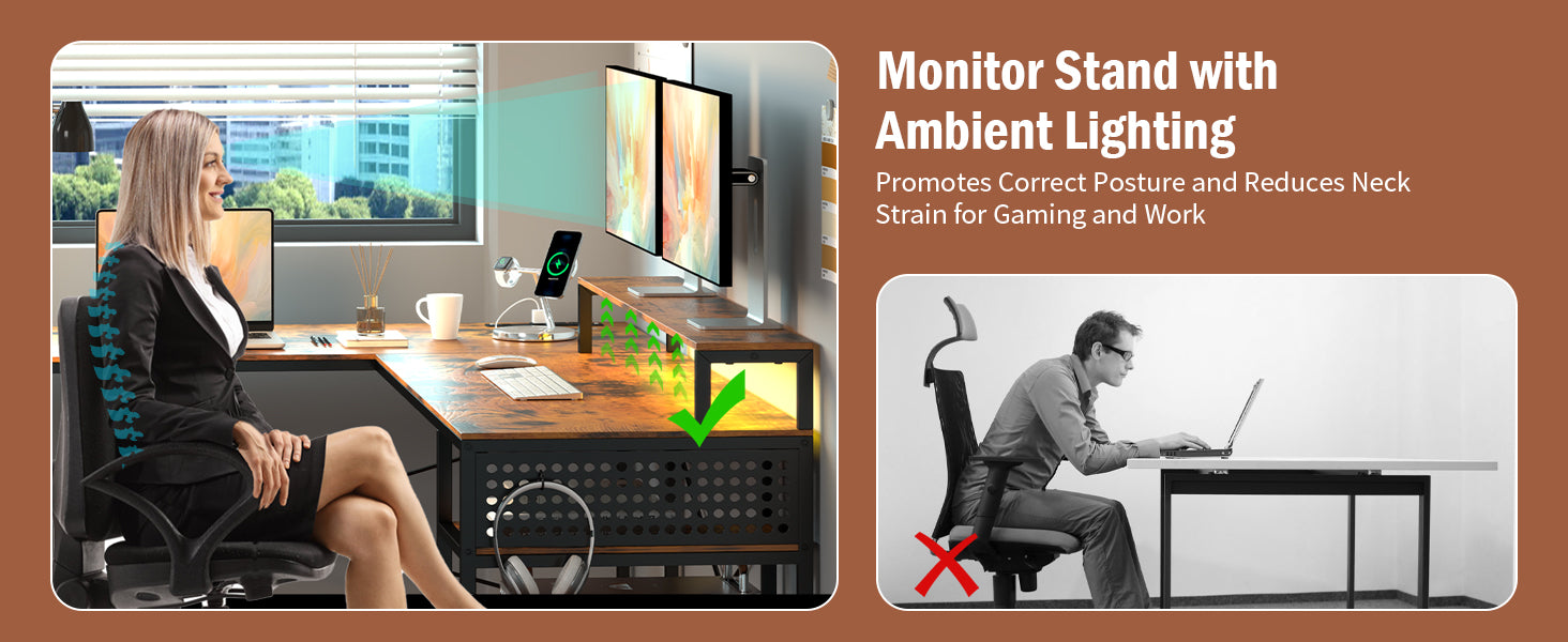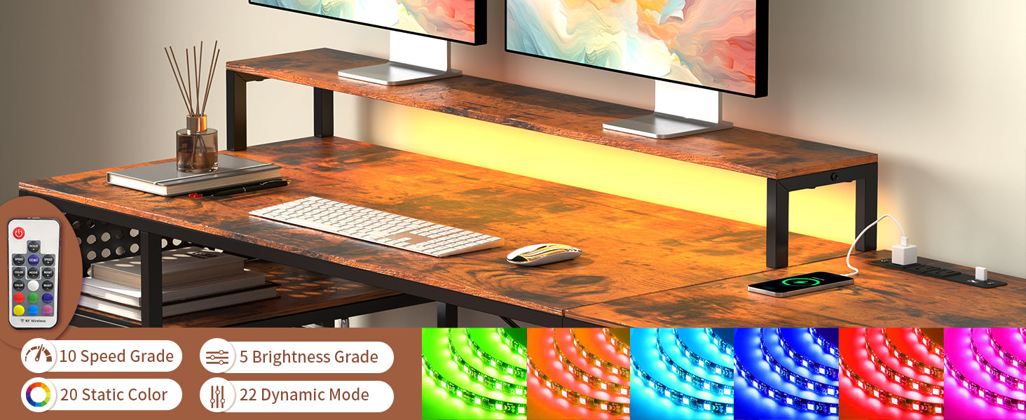 - Monitor Shelf & LED Lighting: Our office desk features a detachable monitor shelf, elevating your screen to reduce neck and back strain. Integrated RGB LED light strips offer 60,000+ colors and various dynamic modes. The music sync feature makes the lights react to sound, creating a vibrant and immersive atmosphere for gaming or work