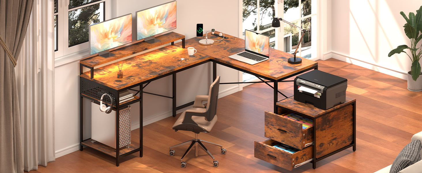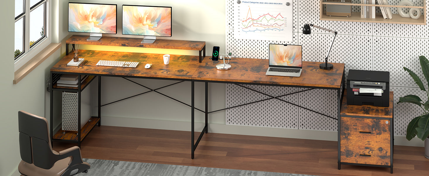 - Four Configurable Layouts: Our desk offers a reversible design, allowing for four installation options: a 66" x 65" L-shaped desk for corners, a 113" long double desk, or alternate orientations to fit your space. Its large surface provides ample room for monitors, laptops, printers, books, and more, making it versatile for students, remote workers, or office professionals
