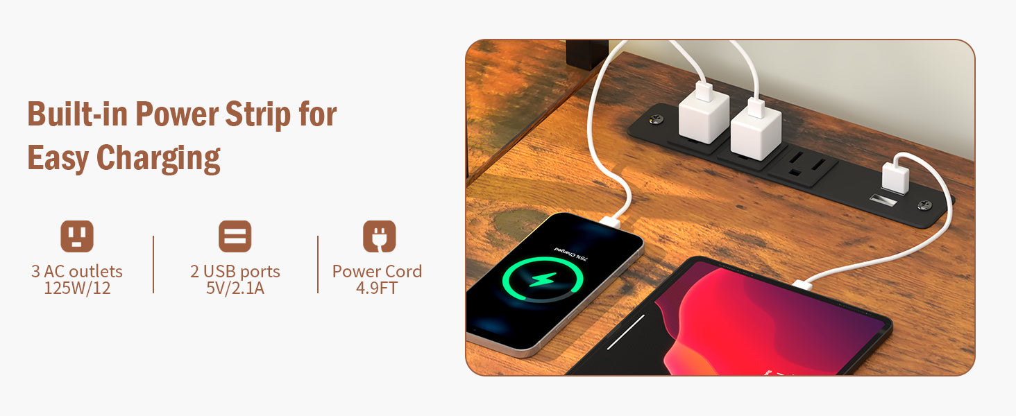 - Built-In Power Strip: A built-in power strip with 3 AC outlets and 2 USB ports provides seamless charging for your devices. Whether you’re gaming, in the middle of an intense meeting, or working on creative tasks, you can keep your equipment fully charged without the hassle of extra extension cords cluttering your space