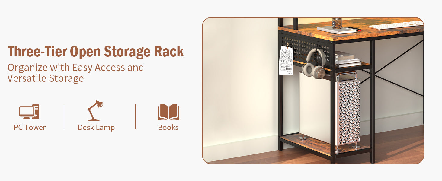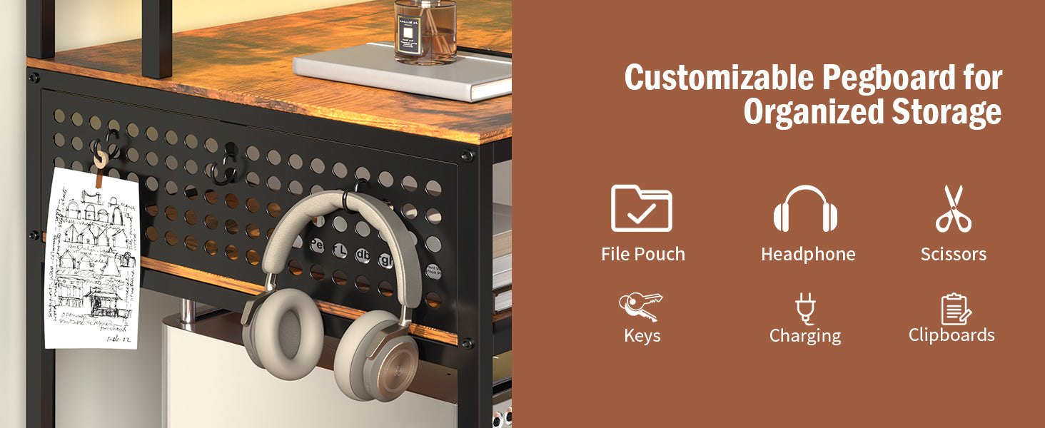 - Sturdy Wooden Storage: This wood desk features a customizable pegboard, a wooden drawer cabinet with metal support, and an under-desk PC host rack. These storage solutions help reduce clutter and maximize organization, providing ample space for accessories while preserving legroom for a clean and comfortable workspace