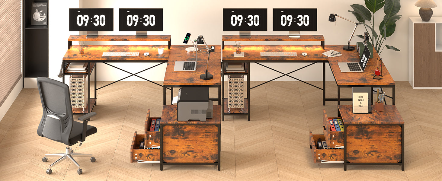 66" L Shaped Desk with Wood Drawers, 113" 2-Person Desk with Printer Stand, Power Outlet, Brown