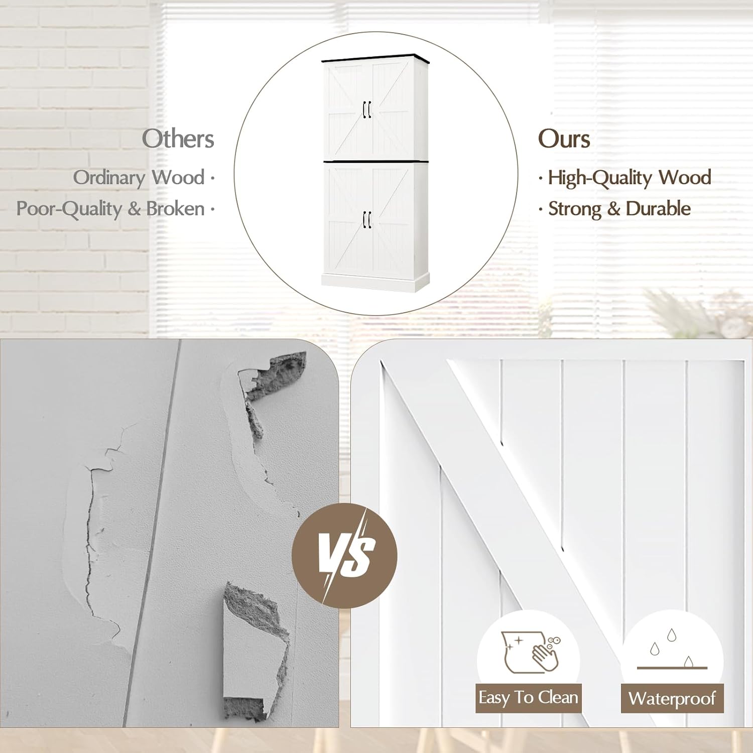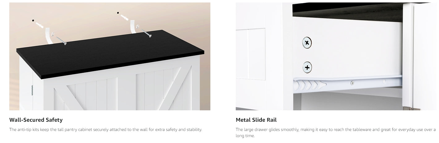 - Solid and Stable: This kitchen pantry cabinet is made of solid, crack-resistant MDF boards that guarantee durability; It can be fixed to a wall with the provided anti-tipping device to enhance safety