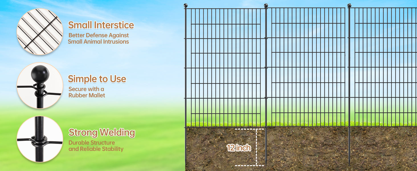- Robust Construction: This garden gate and fencing are crafted through welding using 0.5x0.5-inch premium steel tubes, ensuring exceptional durability. The stakes, with a diameter of 10mm, can be securely driven deep into the ground, linking fence sections tightly and providing a steadfast structure. It functions flawlessly as a gated fence.
