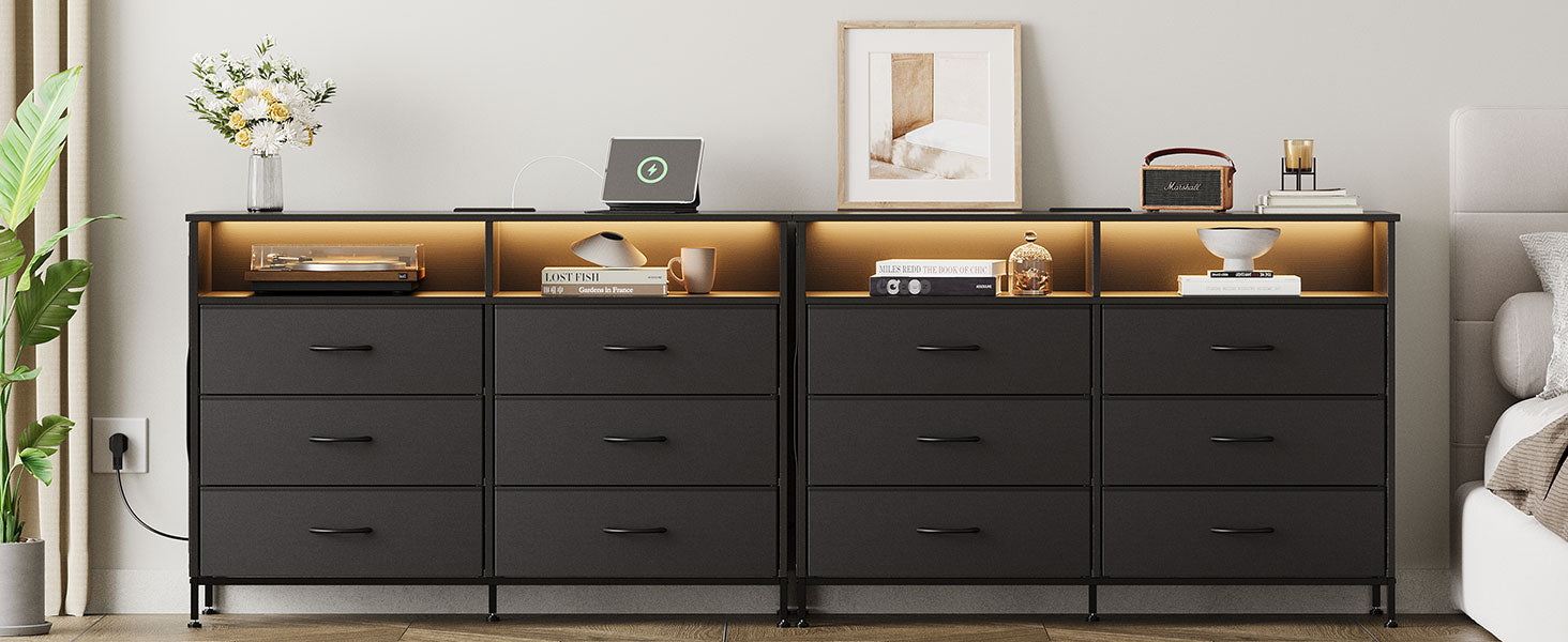 Black 6 Drawer Dresser for Bedroom with LED Lights and Charging Station, Modern Wood Dressers with Extra Side Bag, Double Wide Drawer Cabinet TV Stand for up to 60" TV for Living Room
