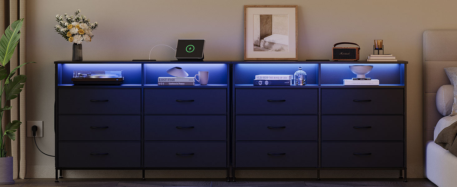 - ๐๐๐ฌ๐ฌ๐ข๐ฏ๐ ๐๐ญ๐จ๐ซ๐๐ ๐ ๐๐ง๐ ๐๐๐๐๐ญ๐ฒ ๐ ๐ข๐ซ๐ฌ๐ญ: Storage space is always at a premium, especially in the bedroom. That's why our dresser with led lights comes with 6 roomy non woven fabric drawers and 3 handy side pockets, providing ample space to store all your essentials, from clothes and accessories to books and bedtime essentials. But we didn't stop there. Safety is a top priority, so we've included an anti tipping bracket on the back. This ensures that your dresser with led lights stays securely in place, giving you peace of mind, especially if you have little ones or furry friends running around.