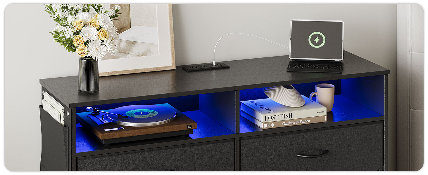 - ๐๐ฎ๐ข๐ฅ๐ญ ๐ข๐ง ๐๐ก๐๐ซ๐ ๐ข๐ง๐ ๐๐ญ๐๐ญ๐ข๐จ๐ง: Our dresser for bedroom wide dressers has the perfect solution. It's equipped with 2 AC and 2 USB sockets, making it a convenient charging station right next to your bed. Charge your phone, tablet, or any other device without having to search for an outlet. Keep your devices close at hand and your bedside table clutter free.