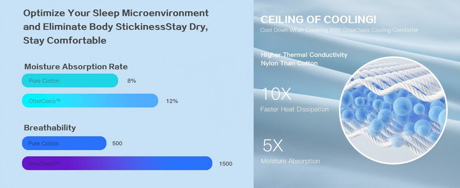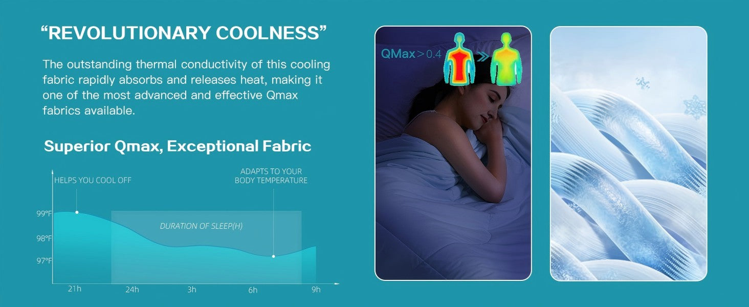 - Advanced Cooling Technology: Made with revolutionary Q-Max > 0.4 cooling fabric, the OtterOasis Cooling Comforter absorbs body heat and moisture, reducing skin temperature by 2-5°C. Whether you're a hot sleeper, experiencing menopause hot flashes, or struggling with night sweats, this comforter keeps you cool and comfortable throughout the night, ensuring you wake up rested and refreshed, without the sticky feeling.