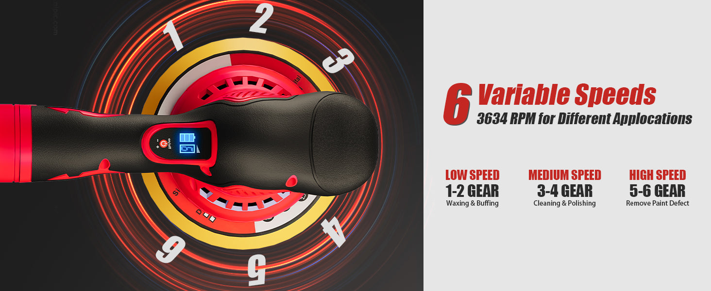 - 【Precision Polishing with Adjustable Speeds】Equipped with 6 adjustable speed settings, this cordless car buffer allows you to fine-tune the random orbital speed from 2800 to 5500 RPM. Whether you're performing light waxing, removing swirl marks, or handling intensive paint correction, you can easily select the ideal speed for the task. Enjoy unparalleled control for achieving a professional-grade finish on every surface.