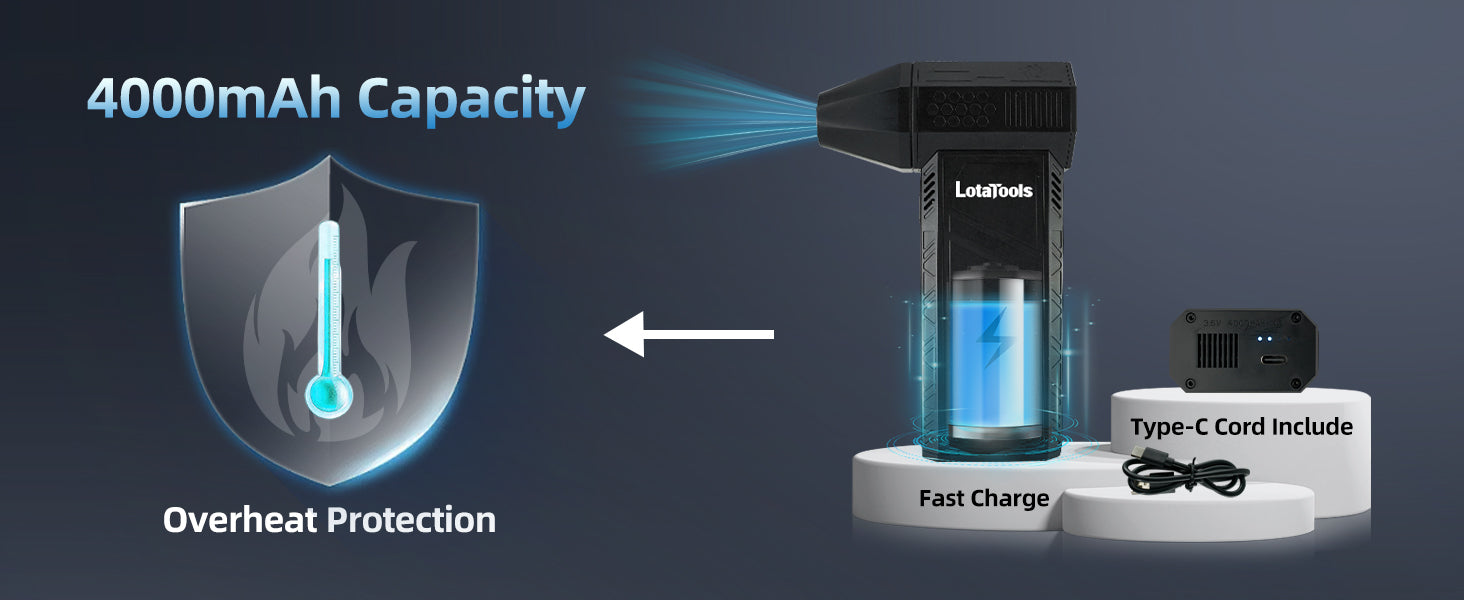 - 【Long Battery Life and Fast Charging】:Stay powered up with our battery-powered blower, offering an impressive 1.5 to 3 hours of runtime depending on usage. With Type-C fast charging supporting up to 10W, you can quickly recharge and get back to work in no time. Safety is paramount with overload protection, overheat protection, and an auto-standby mode after 3 minutes of inactivity. A perfect match for those looking for a blower with long battery life and efficient charging.