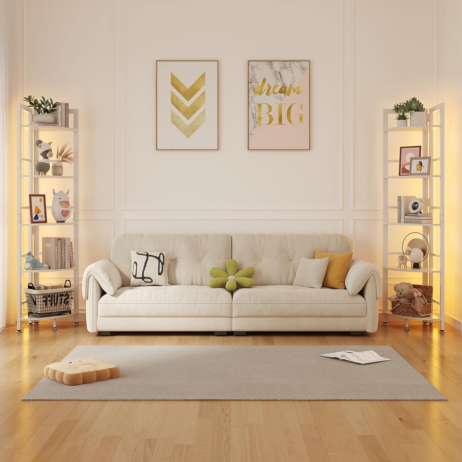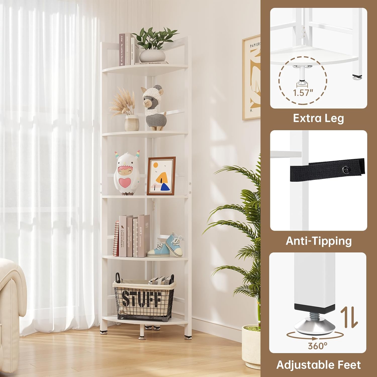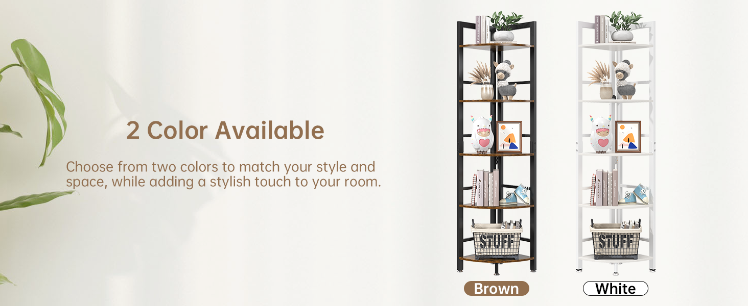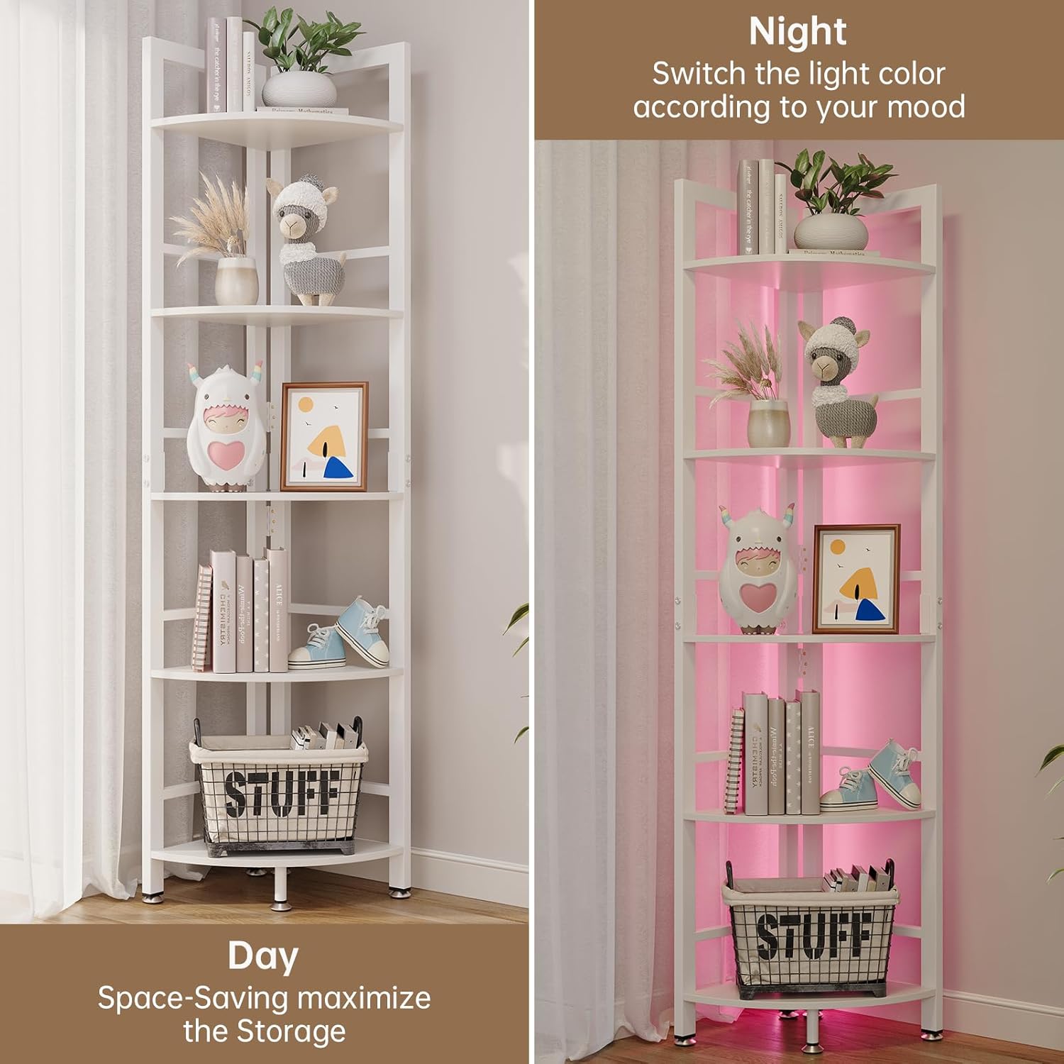 Corner Shelf Stand, 5-Tier Corner Shelf with LED Light, 70 Inch Tall Display Shelf for Living Room, Bedroom, Bookshelf, Industrial Shelf with Steel Frame, Plant Shelf (White)