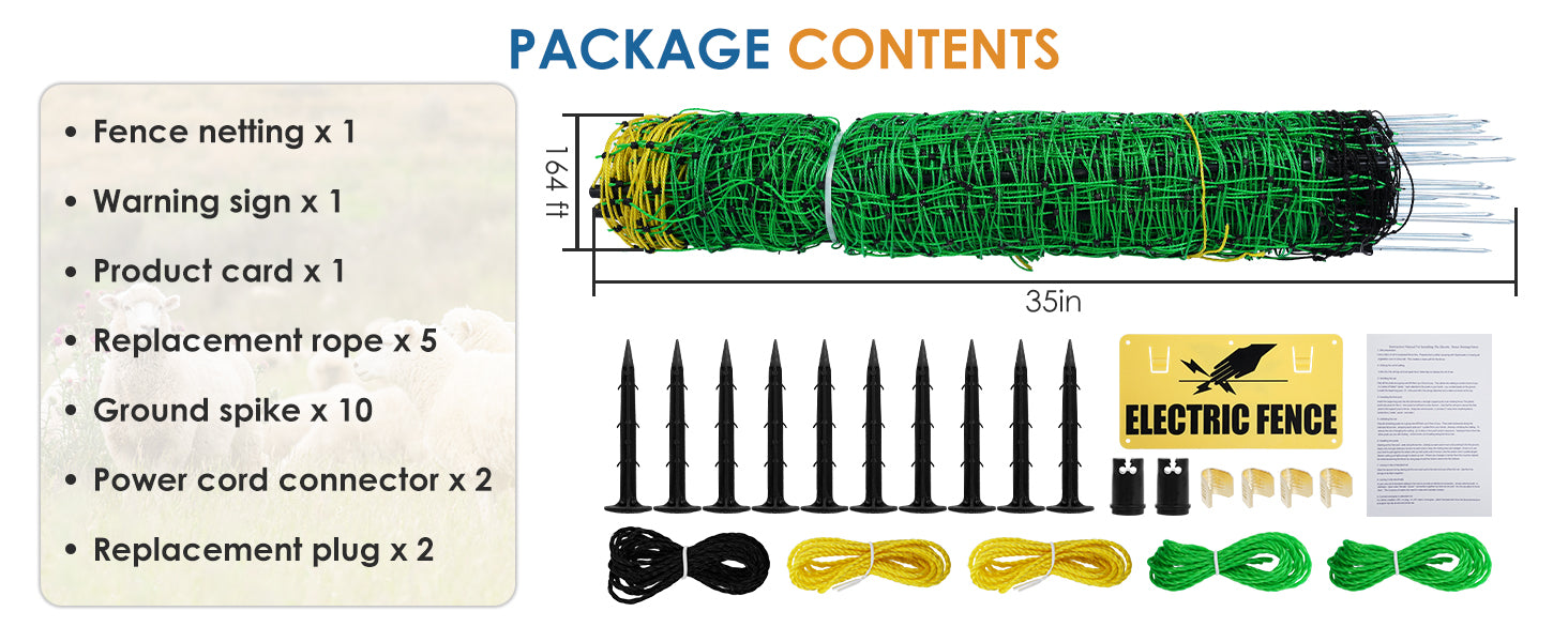 - 【COMPREHENSIVE SIZE DESIGN】: Electric fence netting is carefully designed in a large 35 inch x 164 foot size, combined with scientifically designed grid spacing to ensure a strong enclosure for animals of all sizes. Each double nailed wood stake and fiberglass post is precisely spaced to provide the strongest fence stability.