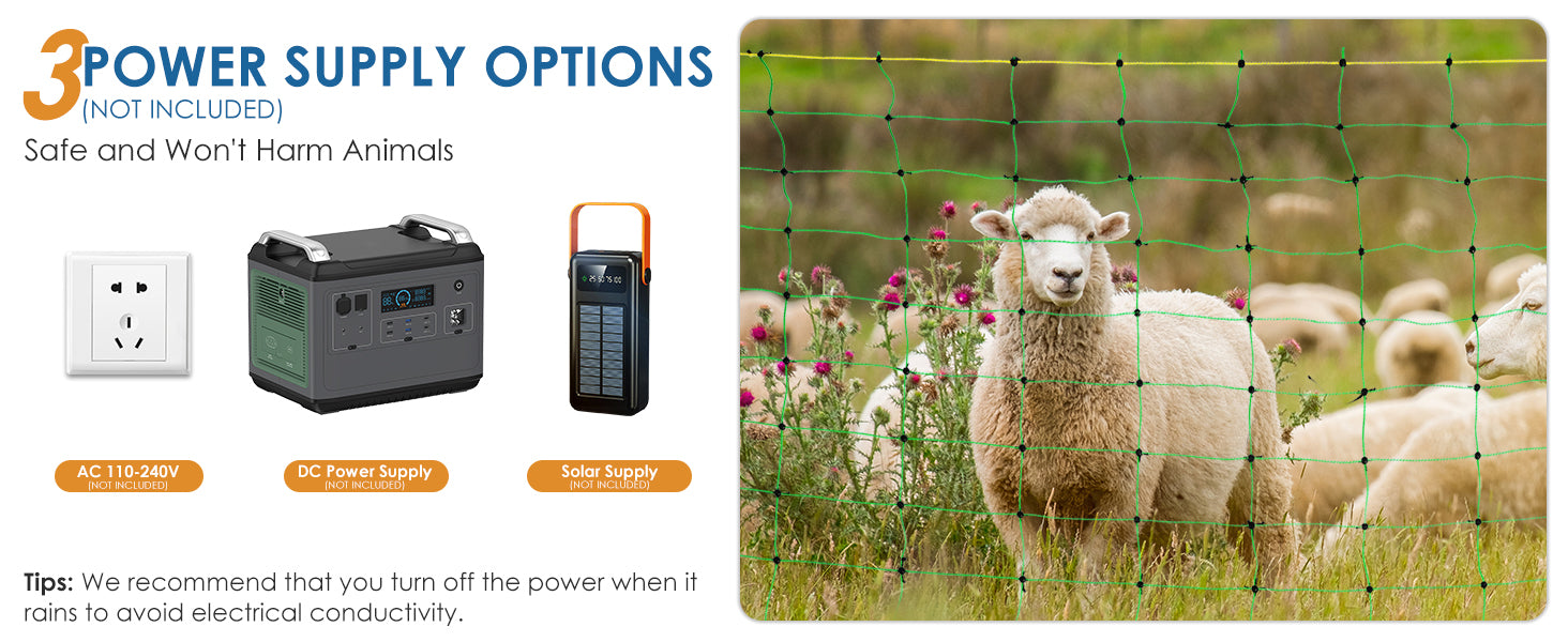 - 【MULTIPLE POWER SUPPLY OPTIONS】: This electric fence supports AC110-240V external power supply, as well as solar panels and DC power supply (not included). These multiple power supply options reduce energy consumption and provide a green solution for your farm.