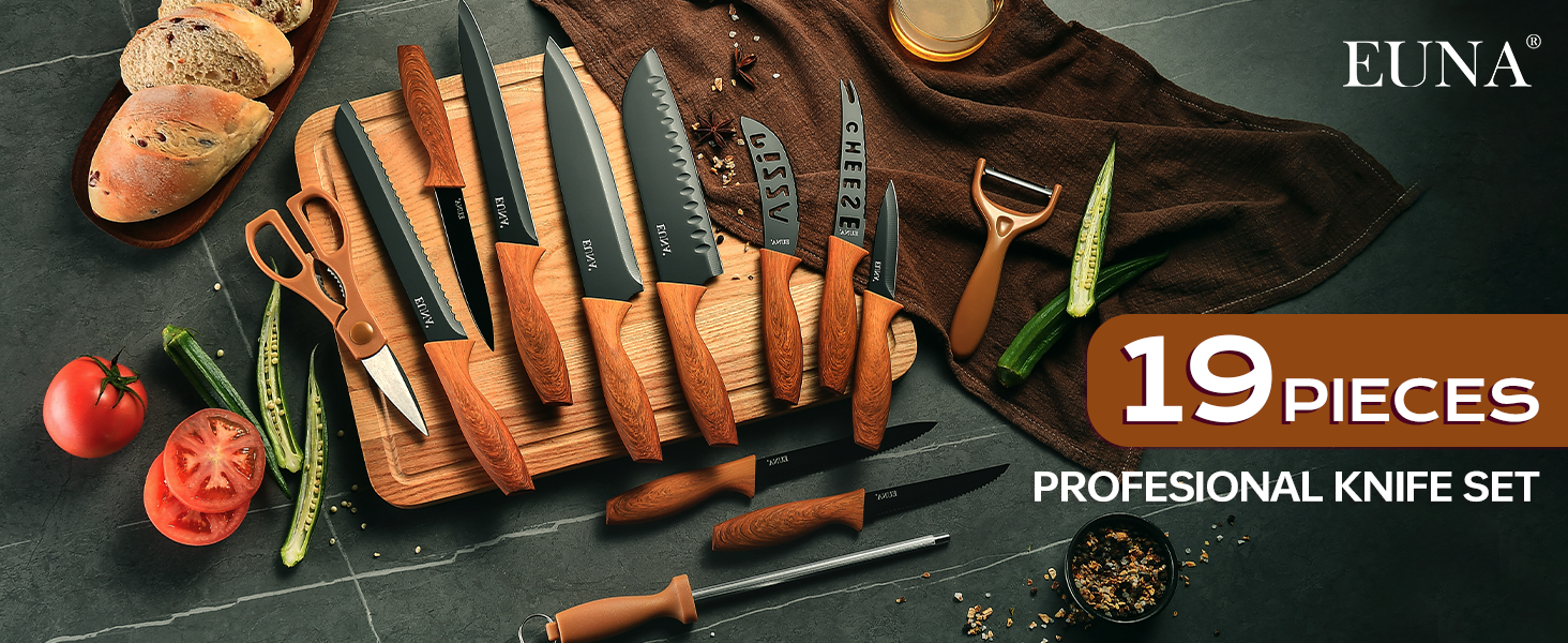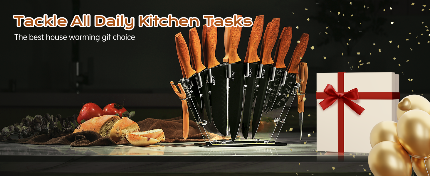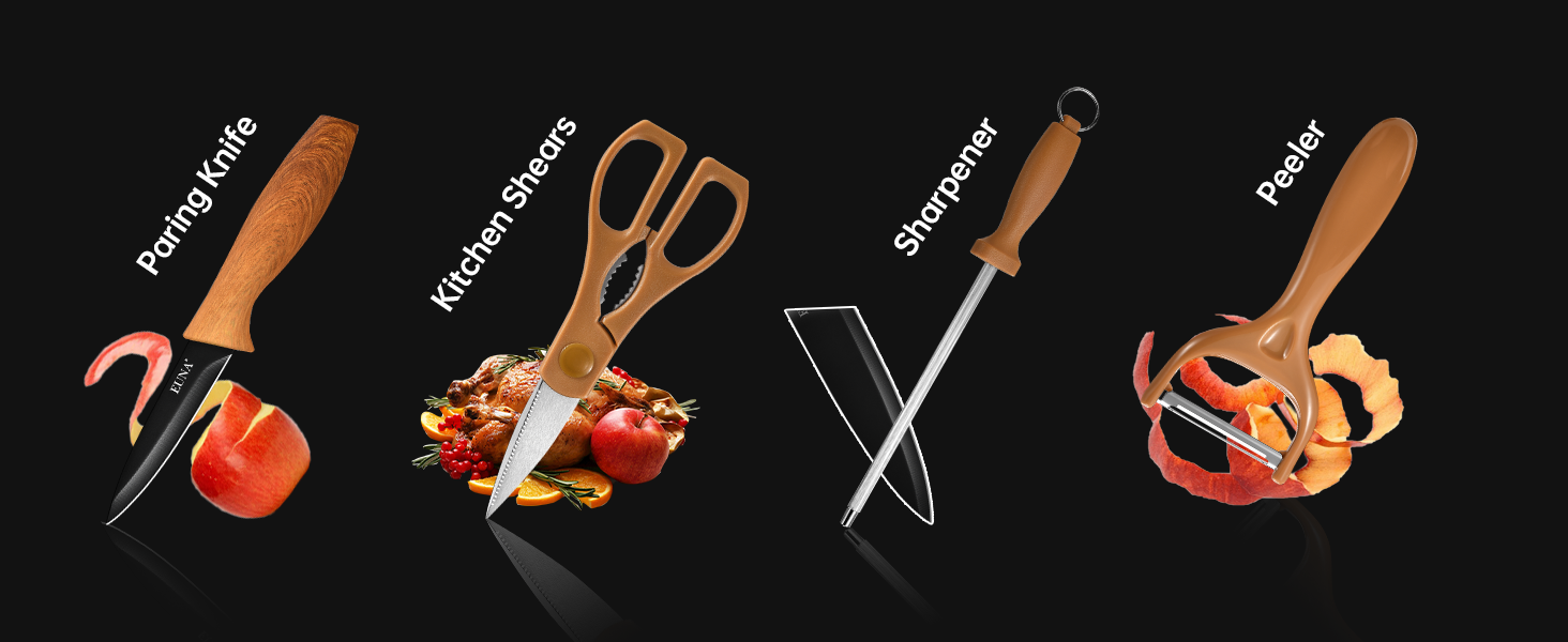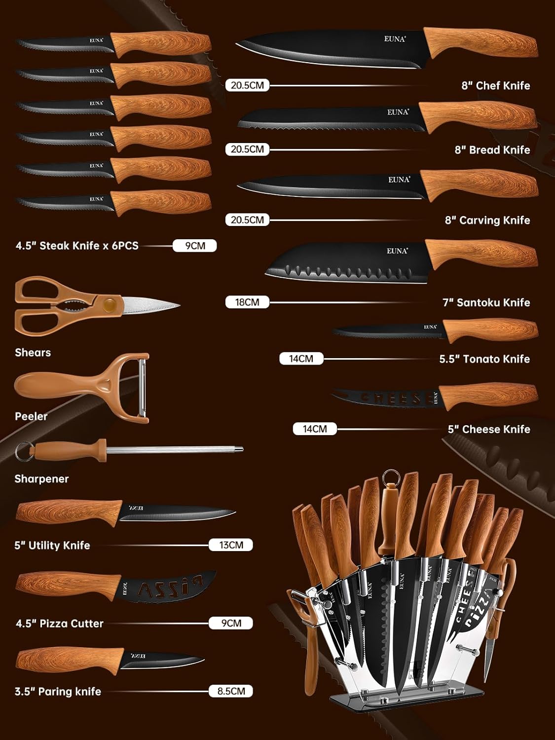 Included Components | Steak knives x 6, Chef knife x 1, Carving knife x 1, Santoku knife x 1, Utility knife x 1, Pizza knife x 1, Cheese knife x 1, Tomato knife x 1, Bread knife x 1, Paring knife x 1, Peeler x 1, Sharpen steel x 1, Scissors x 1, Acrylic stand x 1 |