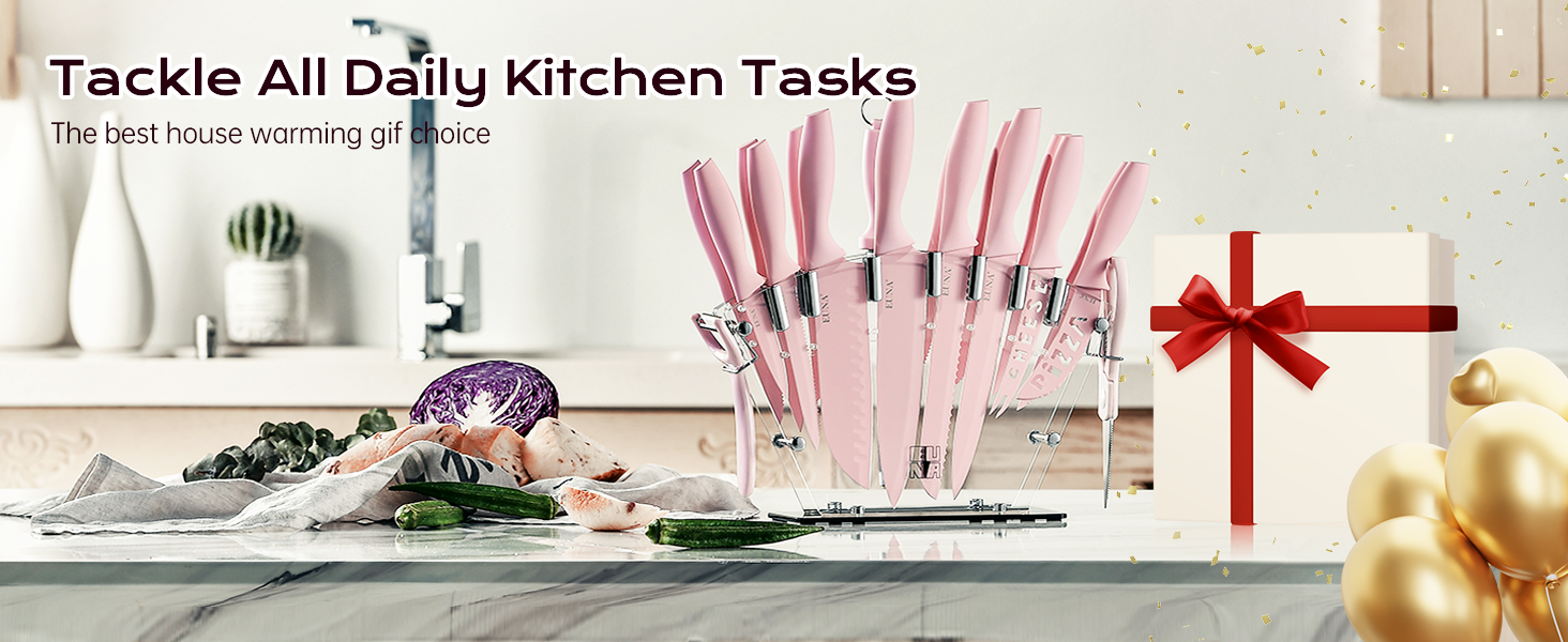 - Fashion Clear Acrylic Knife Block: The knife block set come with a transparent acrylic knife block that is both beautiful and stable, making it easy to store and display the knives while keeping your kitchen neat and organized.