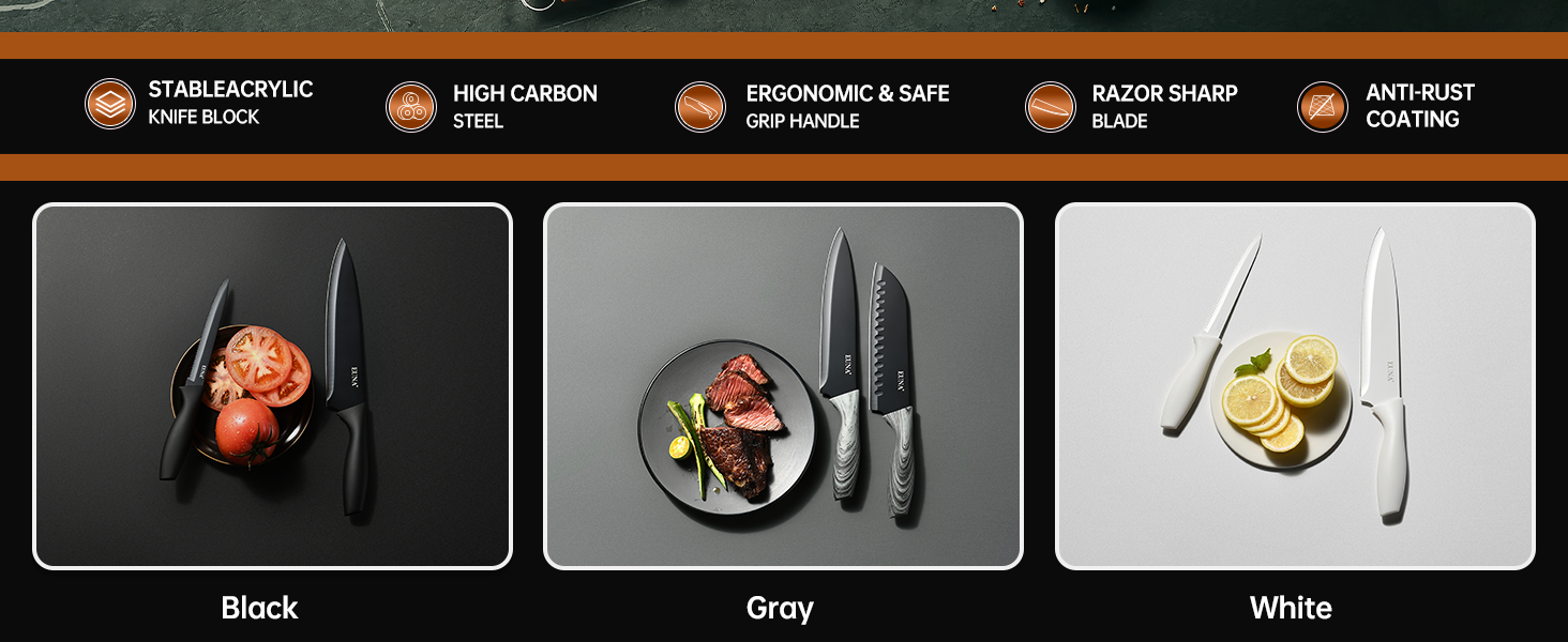 - Anti-Rust Knife Set: Our knives feature an advanced food safe anti-rust coating, ensuring long-lasting freshness and resistance to rust, keep your knives consistently sharp and effortlessly handle everyday cooking tasks.