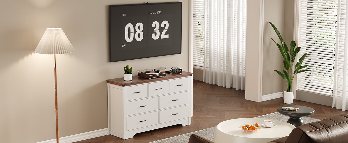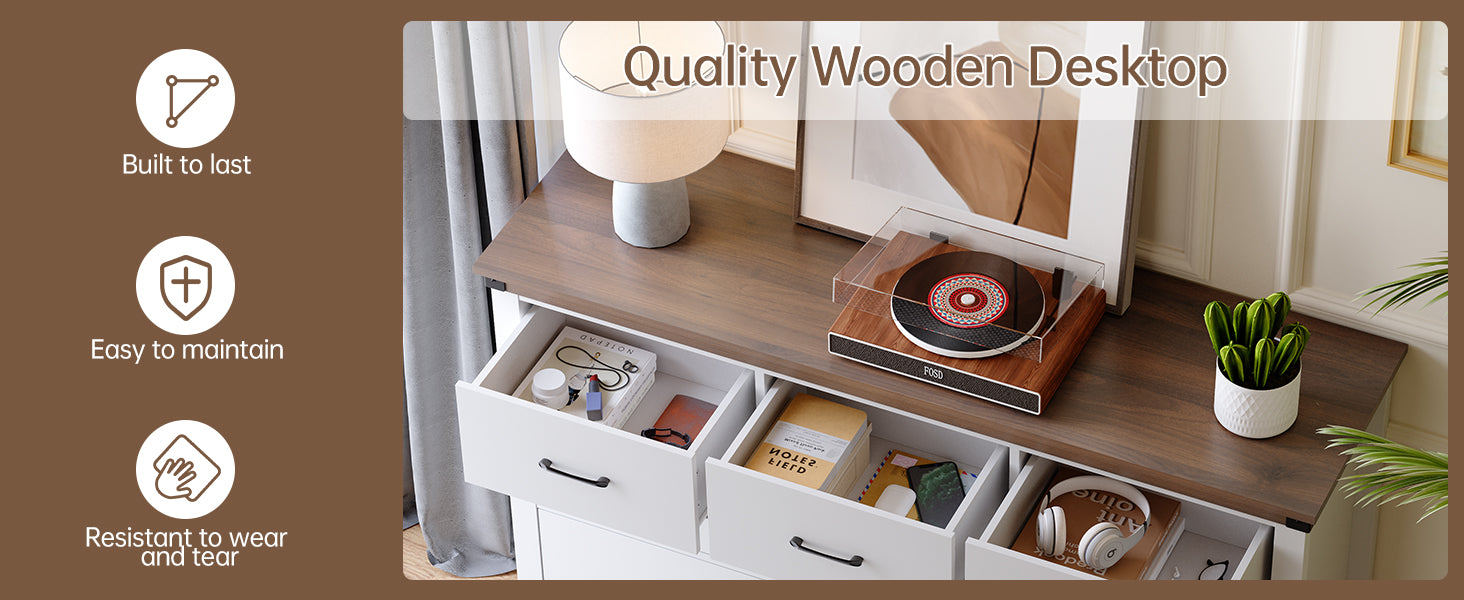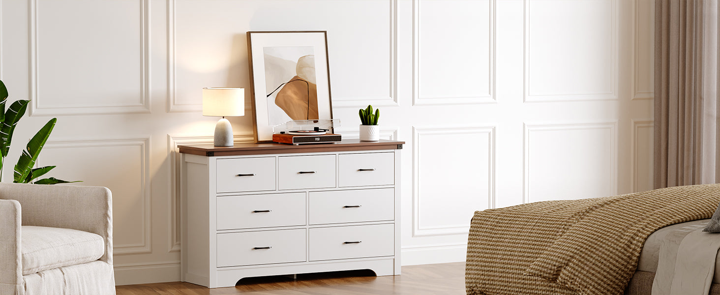 - 【Stable & Sturdy Construction】Crafted from thick, high-density engineered wood, this bedroom dresser combines durability with a natural texture and resistance to warping. A sturdy 4.13" base ensures excellent stability and high weight capacity, while the 1.8" thick crown molding top can support up to 100 lbs, providing additional space to display cherished photos, artworks, and decorations, transforming your room into a captivating gallery.