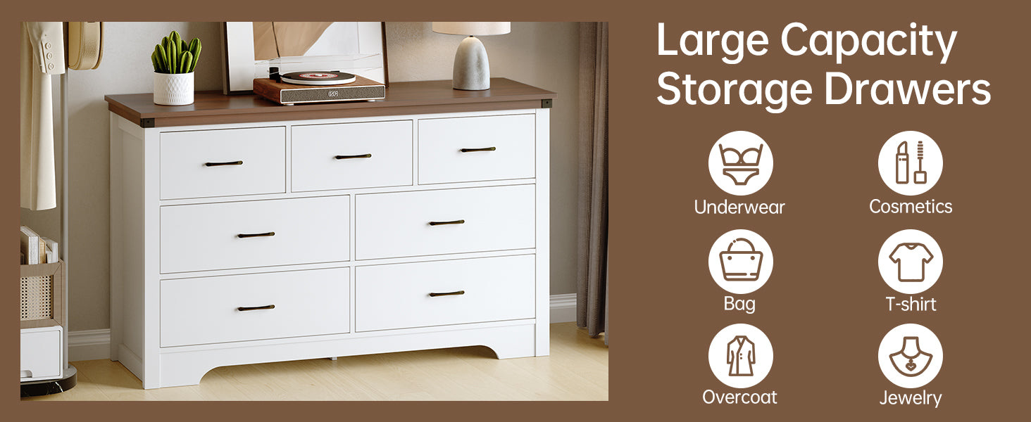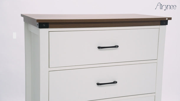 - 【Efficient, Categorized, & Spacious Storage】Equipped with five spacious drawers, this white farmhouse dresser offers ample storage for your belongings, including shirts, underwear, and other wardrobe essentials. Each drawer, measuring 25.3" W x 11.8" D x 5.9" H, can comfortably accommodate 25-30 t-shirts or 20-25 pairs of jeans.