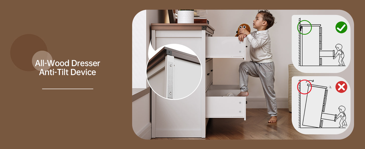 - 【Safe & Secure】This dresser for bedroom includes wall anchors to prevent tipping, ensuring the safety of both you and your family. The dressers & chests of drawers glide open and close smoothly, making it easy for everyone, including little kids, to access their belongings. The widened metal matte handles not only enhance the dresser's aesthetics but also provide a comfortable grip.