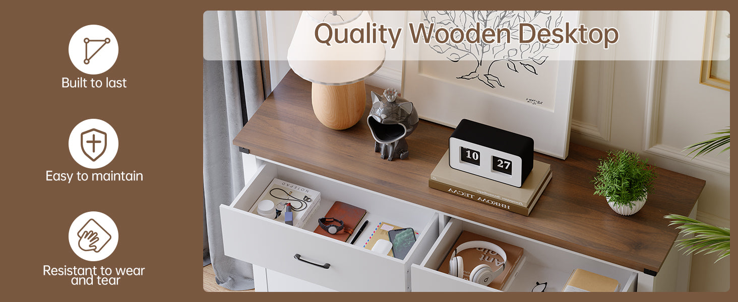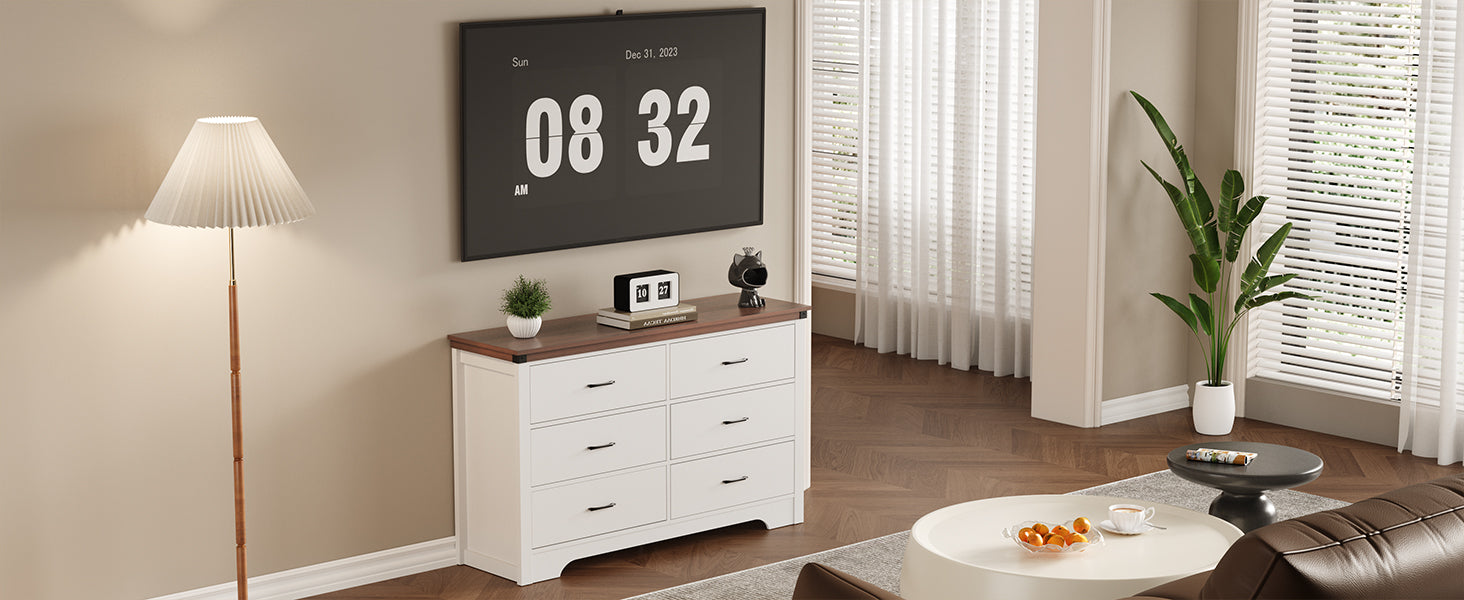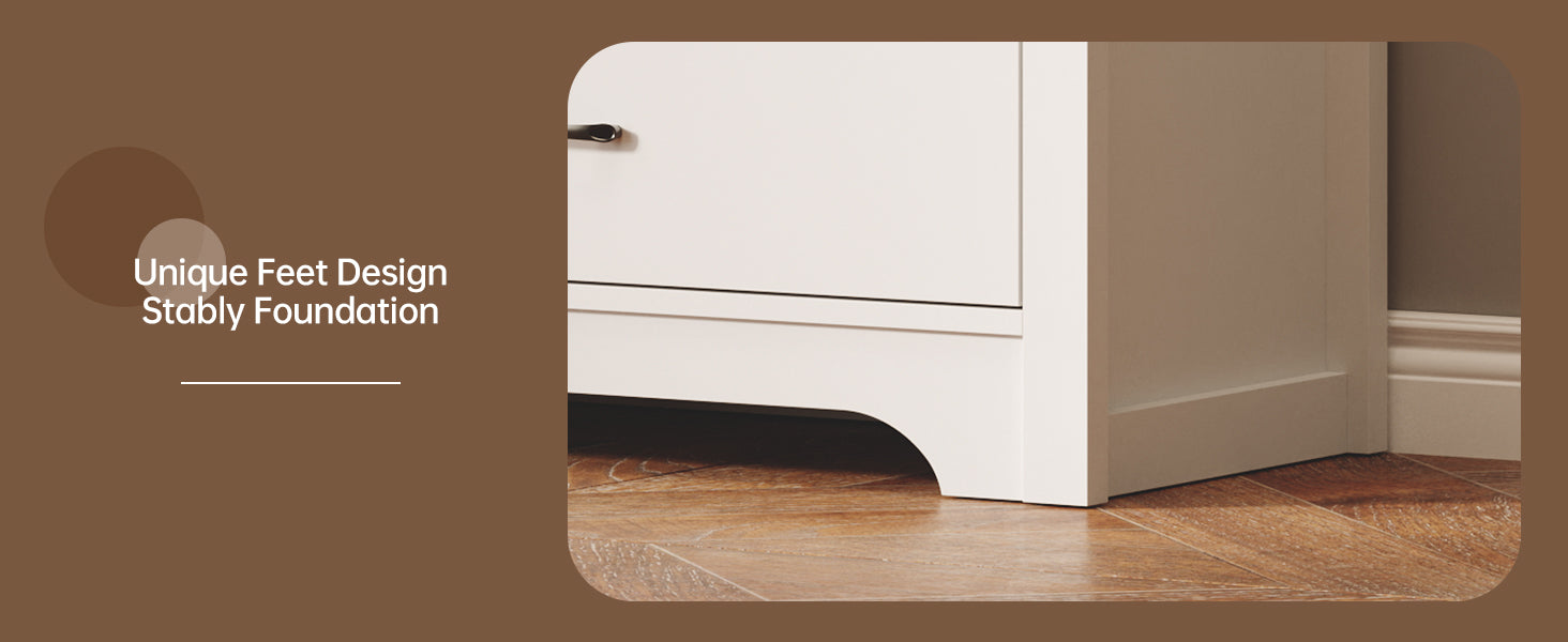 - 【Stable & Sturdy Construction】Crafted from thick, high-density engineered wood, this white farmhouse dresser combines durability with a natural texture and resistance to warping. A sturdy 4.13" base ensures excellent stability and high weight capacity. The 1.8" thick crown molding top can support up to 150 lbs, providing additional space to display cherished photos, artworks, and decorations, transforming your room into a captivating gallery.