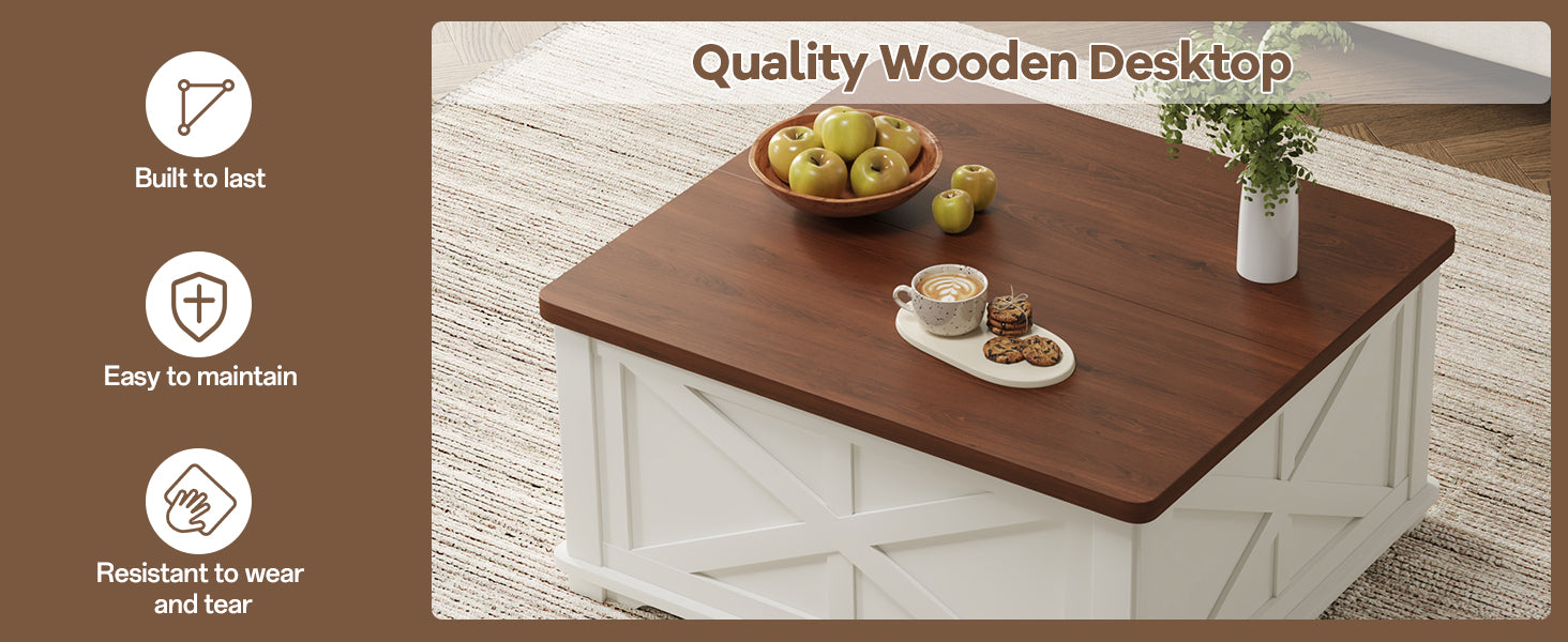 - 【Farmhouse Lift-Top Coffee Table】 Our white square farmhouse coffee table, inspired by the classic barn door design, features a sleek and fingerprint-resistant wood grain finish, perfectly blending modern rustic and vintage farmhouse styles. Its unique square shape and well-proportioned dimensions make it not only aesthetically pleasing but also highly functional, fitting seamlessly into any home decor and enhancing the neatness and brightness of your room.