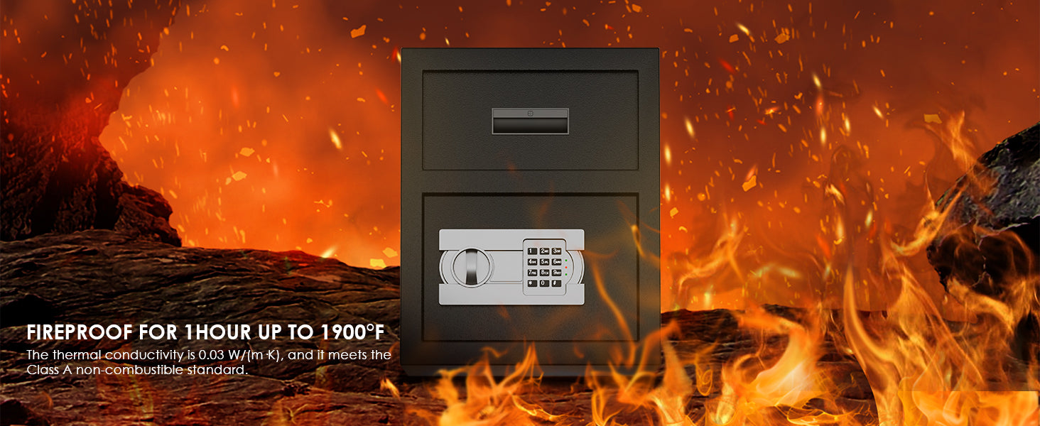 - 【Class A Fireproof Standard】The core filling material, high-density ceramic fiber, has an ultra-low thermal conductivity of 0.03 W/(m·K), helping slow heat transfer and protecting valuables inside the safe. Built with Class A-rated non-combustible materials, minimize harmful gas emissions, and maintain structural integrity under extreme heat, providing reliable fire protection. Additionally, the high-durability fireproof coating enhances resistance to flame exposure, scratches, and corrosion, ensuring long-lasting durability for years of secure use.
