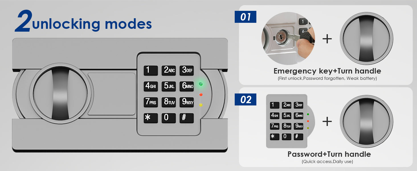 - 【Dual Unlocking Methods】Enhanced with an upgraded security system, our fireproof safe offers dual unlocking options, ensuring both secure and convenient access to your valuables in any situation:①Electronic Password Access – Simply enter your personalized security code and rotate the knob for quick and hassle-free unlocking, perfect for everyday use.②Mechanical Key Backup – In case of a forgotten password or battery depletion, use the emergency key to unlock the safe, ensuring continuous access. The keyhole is discreetly hidden beneath a protective cover, adding an extra layer of security.