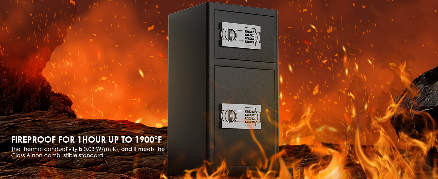 - 【Class A Fireproof Standard】The core filling material, high-density ceramic fiber, has an ultra-low thermal conductivity of 0.03 W/(m·K), helping slow heat transfer and protecting valuables inside the safe. Built with Class A-rated non-combustible materials, minimize harmful gas emissions, and maintain structural integrity under extreme heat, providing reliable fire protection. Additionally, the high-durability fireproof coating enhances resistance to flame exposure, scratches, and corrosion, ensuring long-lasting durability for years of secure use.