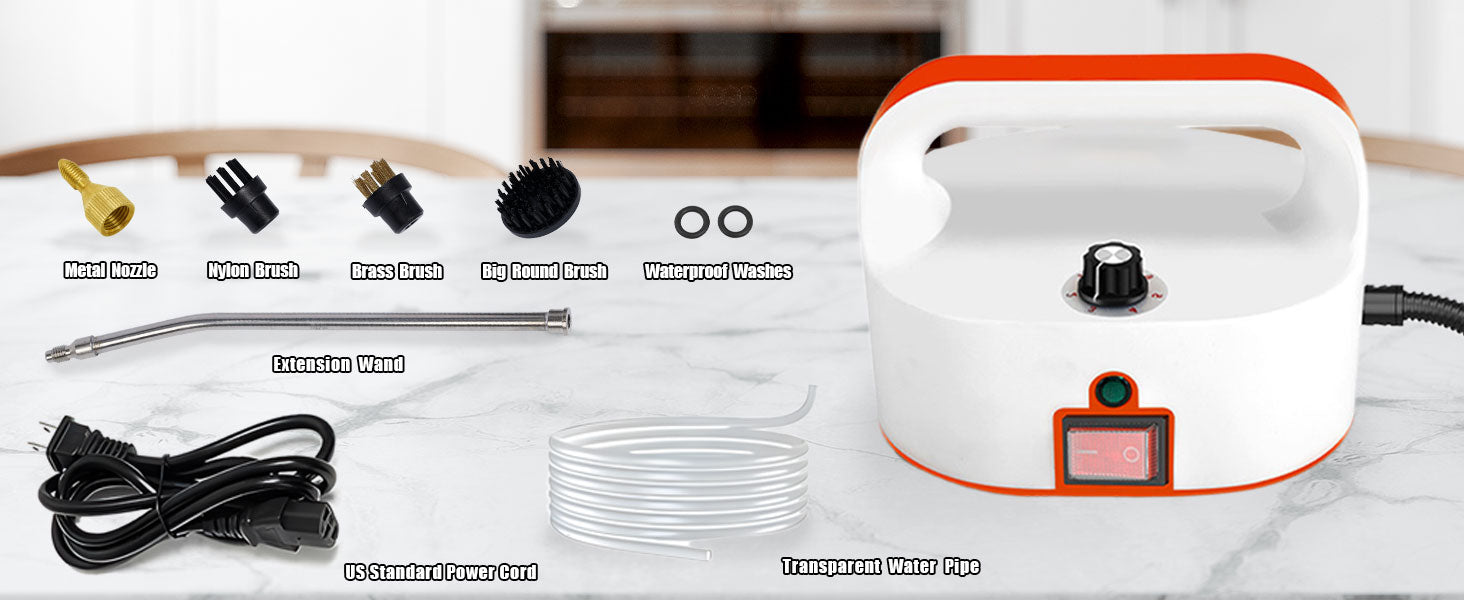 - 【Cleaning Machine Set】You will get a high-pressure steam jet cleaner, an extension pole, a large round brush, a small brush, a steel brush, a short copper nozzle, a power cord, a 1.5-meter steam hose, a 2-meter transparent hose and a pair of heat-resistant gloves