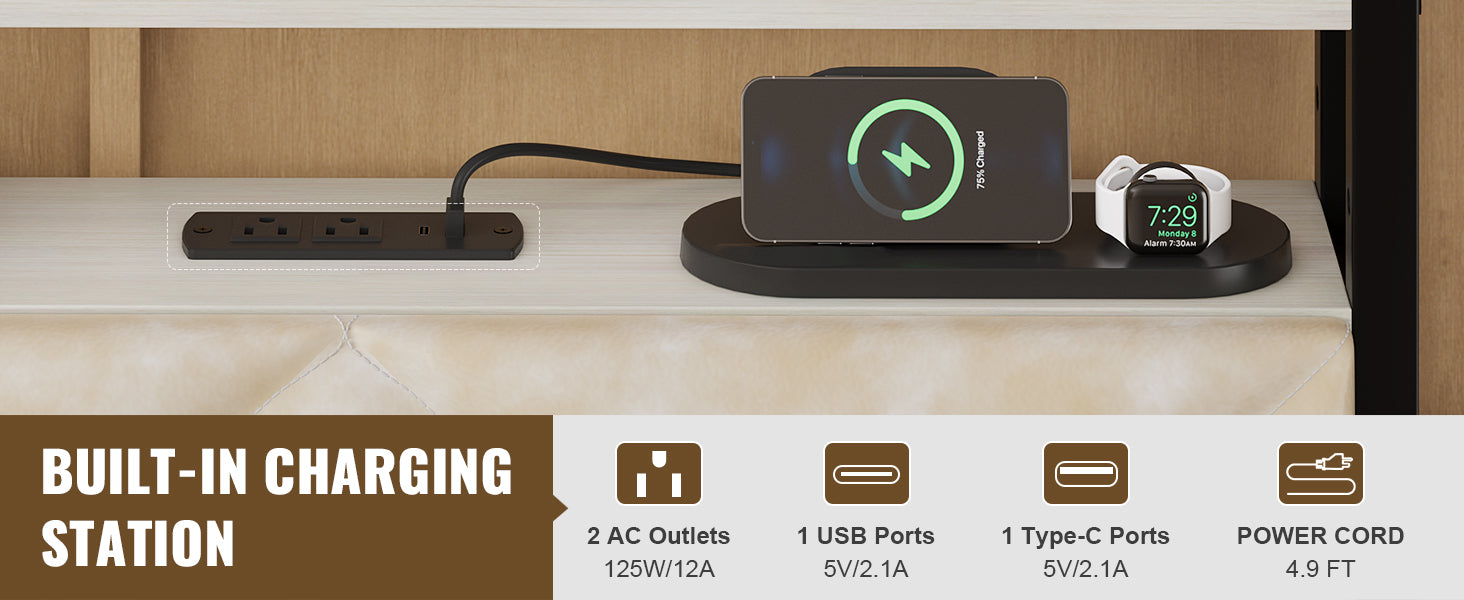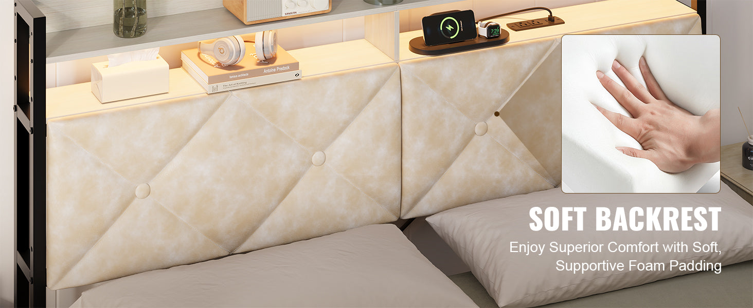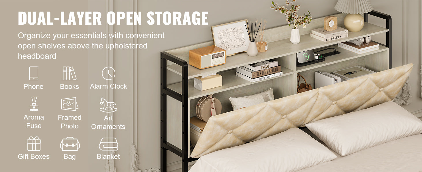 - Two-Tier Shelf and Hidden Storage: Queen size headboard features open shelving for organizing everyday items like phones, books, and alarms. A spacious hidden storage compartment at the back adds flexibility, allowing you to store personal items securely and conveniently