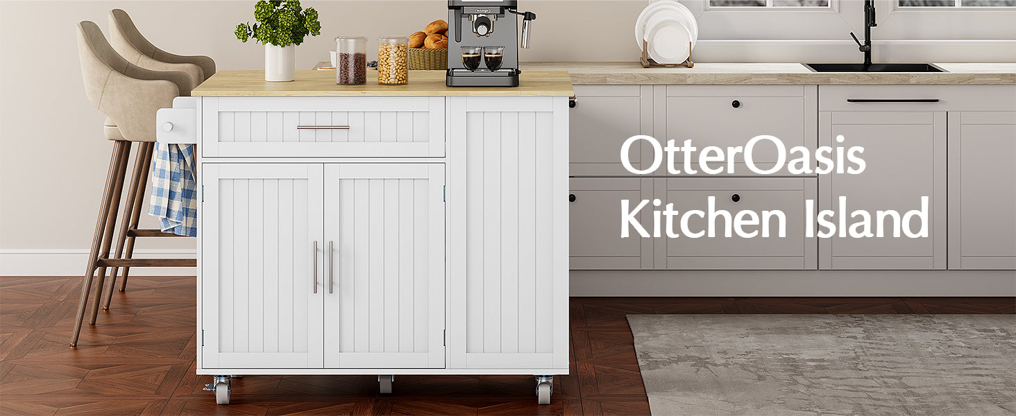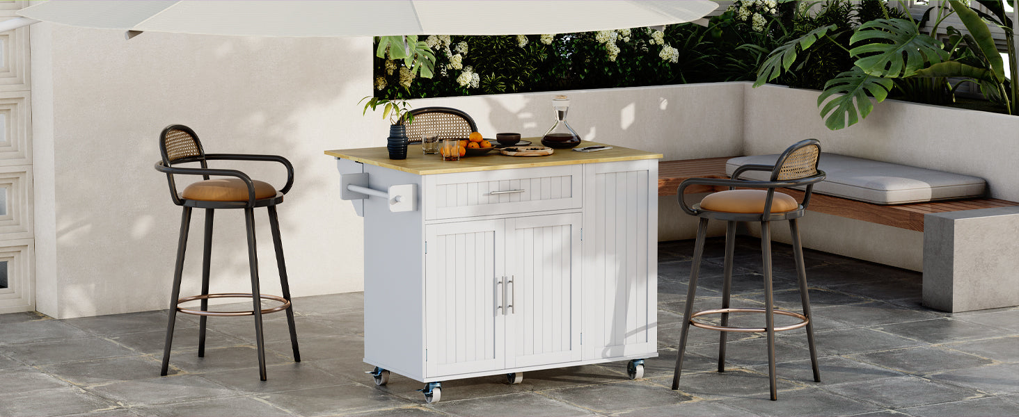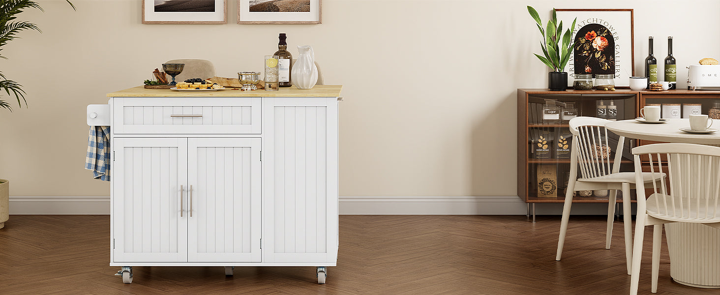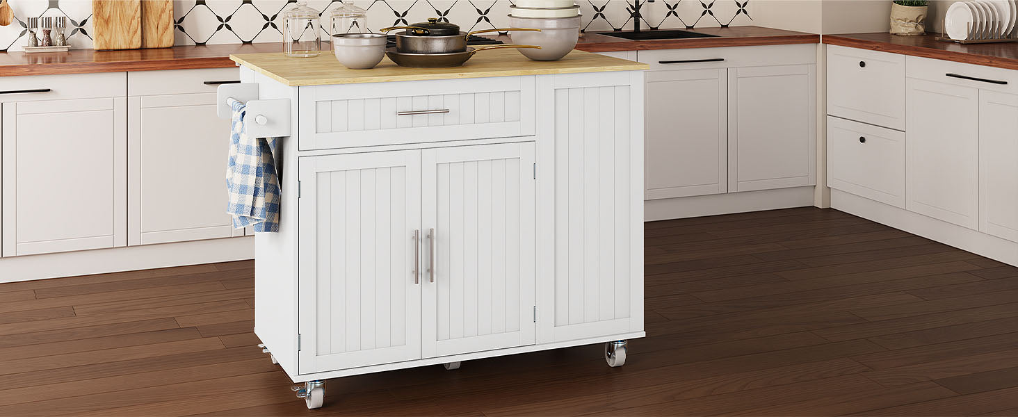- Kitchen Island with Drop Leaf: This kitchen island on wheels features a premium rubberwood top; When folded, it saves space; when extended, the kitchen island table can serve as a coffee table for your leisure time