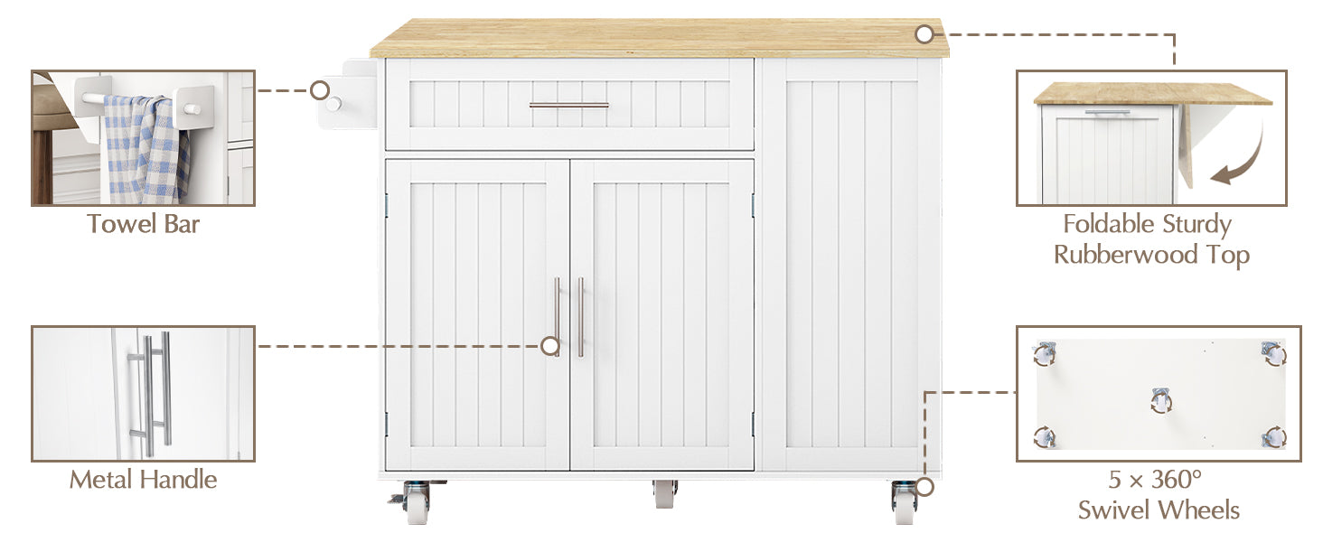 Kitchen Island with Storage, 31.5"D Rolling Cart, Drop Leaf Top, Trash Can Storage & Towel Bar, White