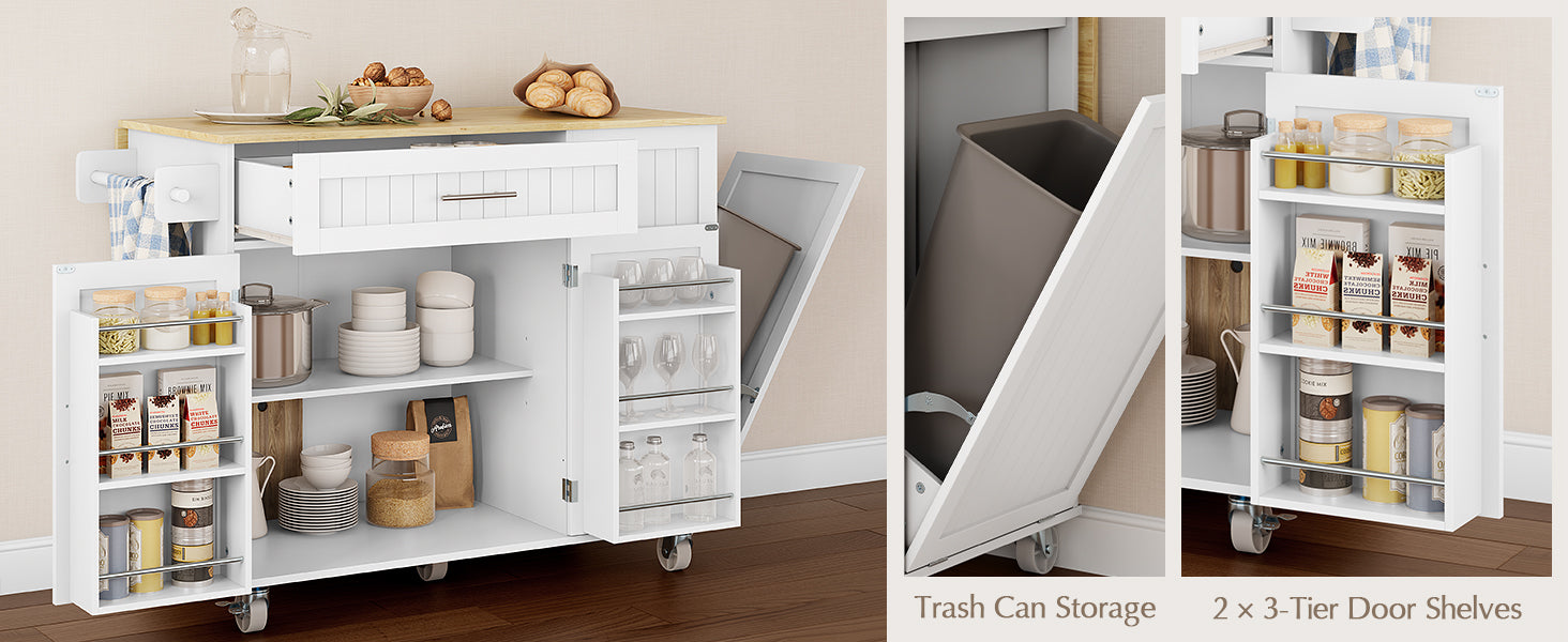 - Kitchen Island with Trash Can Storage: This multifunctional kitchen island cart has a trash can storage space inside the cabinet door that helps keep your kitchen tidy and odor-free