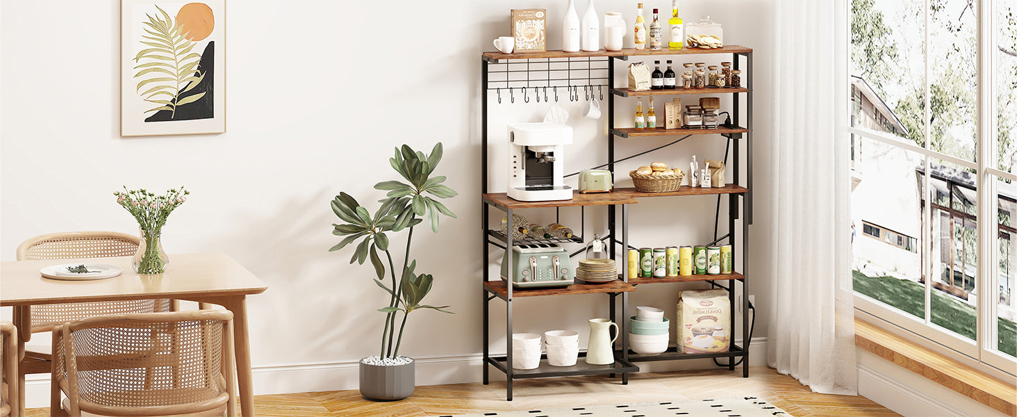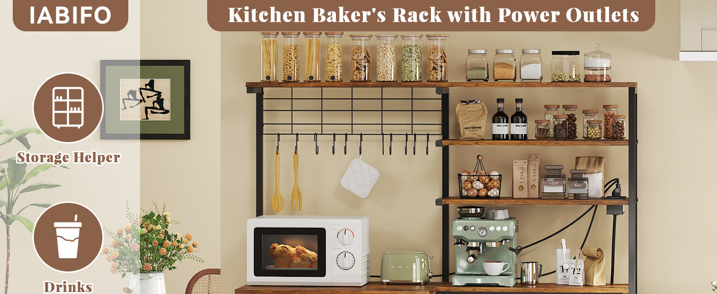 - Built-In Power Strip for Convenience: This baker’s rack features a UL-certified power strip with 3 AC & 2 USB outlets and an on/off switch (1800W max), perfect for powering your microwave, coffee maker, or other kitchen appliances right where you need them, eliminating the hassle of extra cords or outlets.The power cord is 2 meters long.