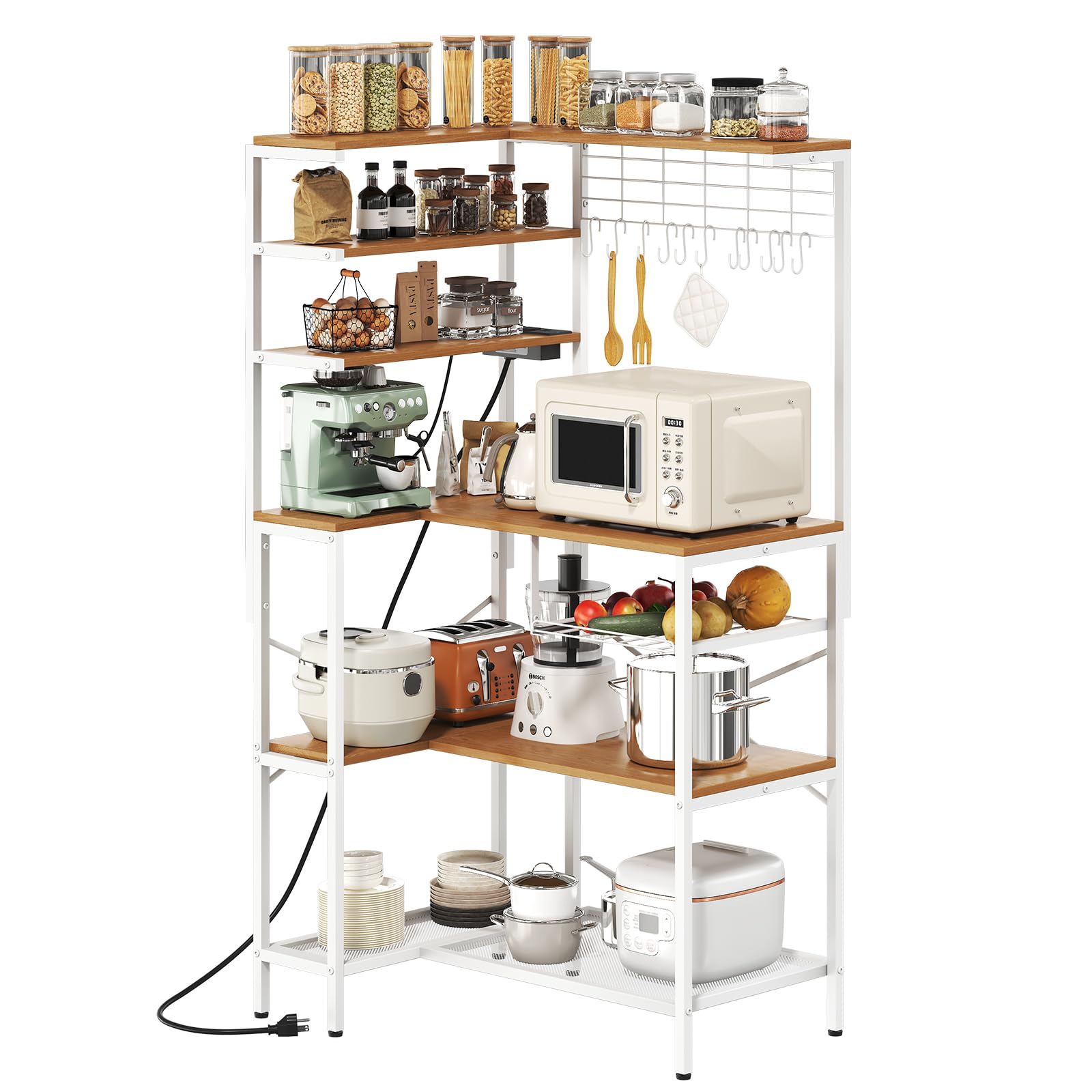 L-Shaped Bakers Rack with Power Outlet, 6-Tier Microwave Stand with Open Storage, Coffee Bar with Hooks, Mesh Grid, Kitchen Shelf with Wire Basket, Rustic Brown and Black