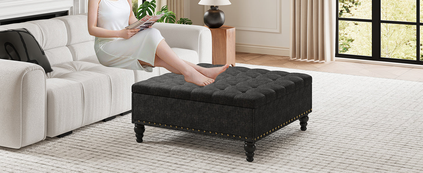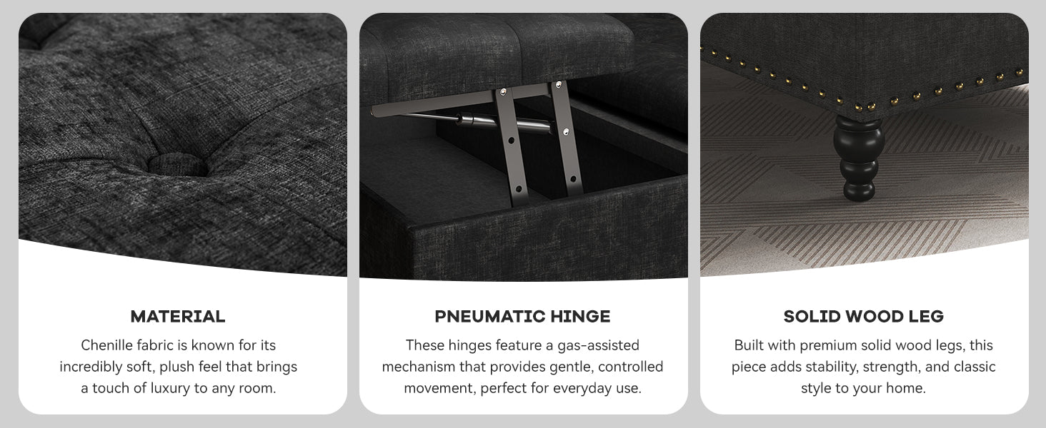 - 【Robust and Long-Lasting】: Built with solid wood legs, our large ottoman can support up to 300 pounds. The metal pneumatic hinges provide stable and reliable performance. Pre-installed nuts make assembly quick and easy, ensuring a sturdy and long-lasting structure.