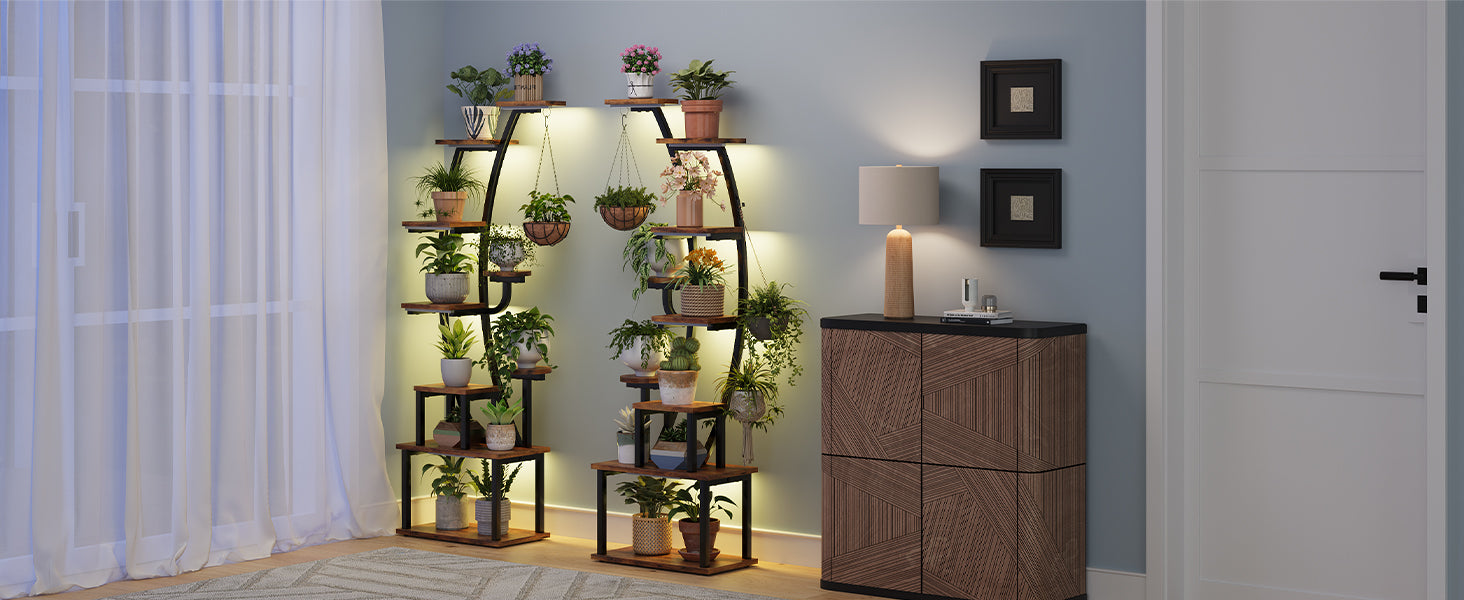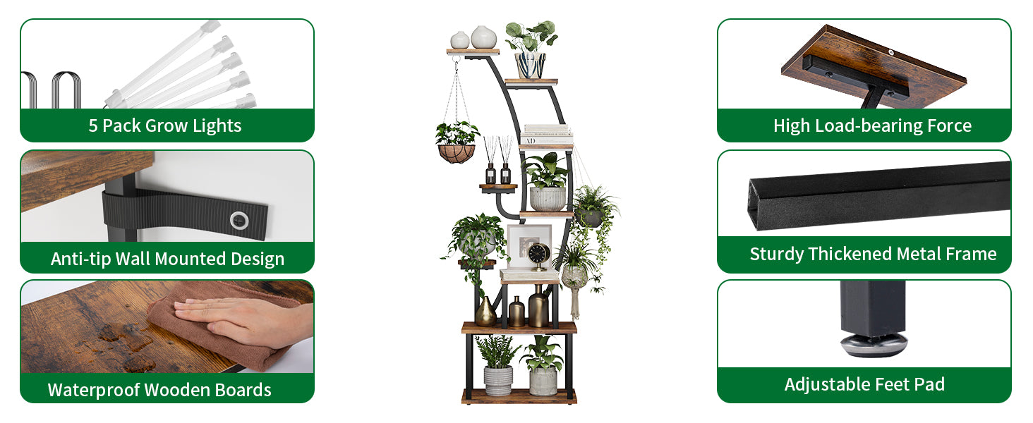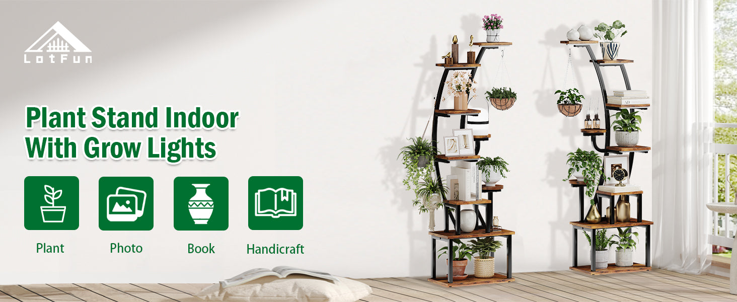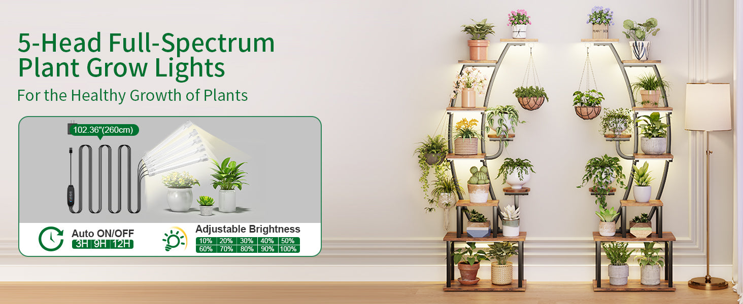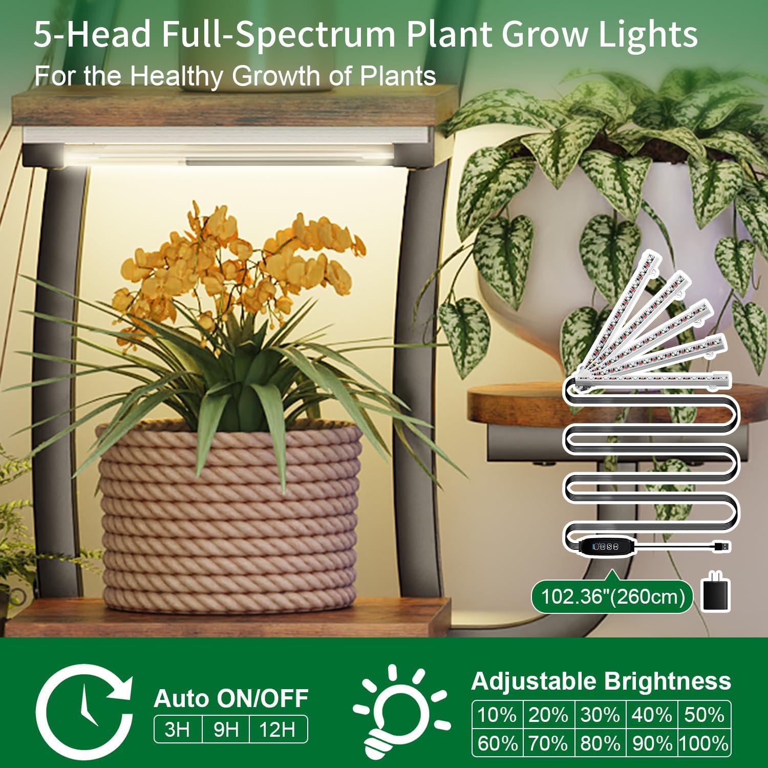 - 【Plant Stand with Grow Lights】The LotFun plant shelf features a five-head plant grow light that can switch between red, white, and blue light modes, providing ample illumination to meet the needs of plants at different growth stages. The package also includes an adapter, making it convenient to adjust brightness, light strips, and the lighting timer. You can place this plant shelf anywhere indoors without needing to frequently move your plants outside to absorb light