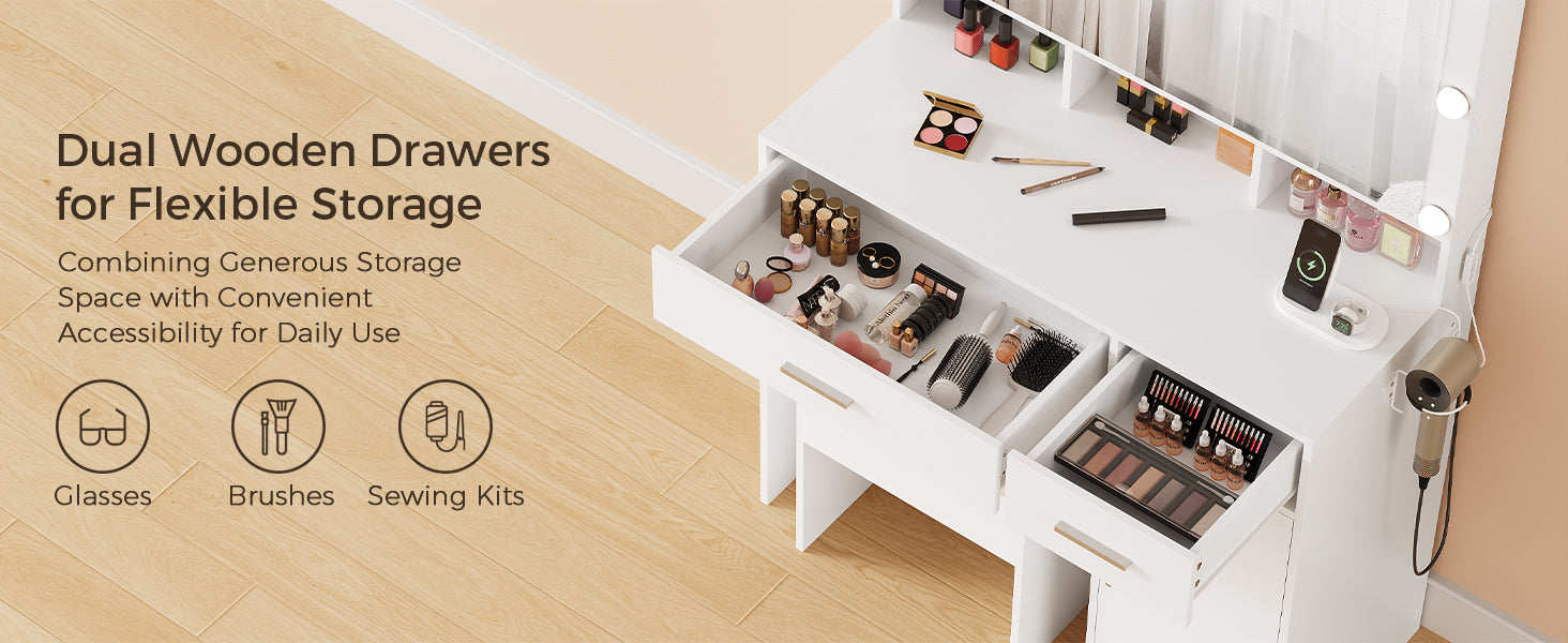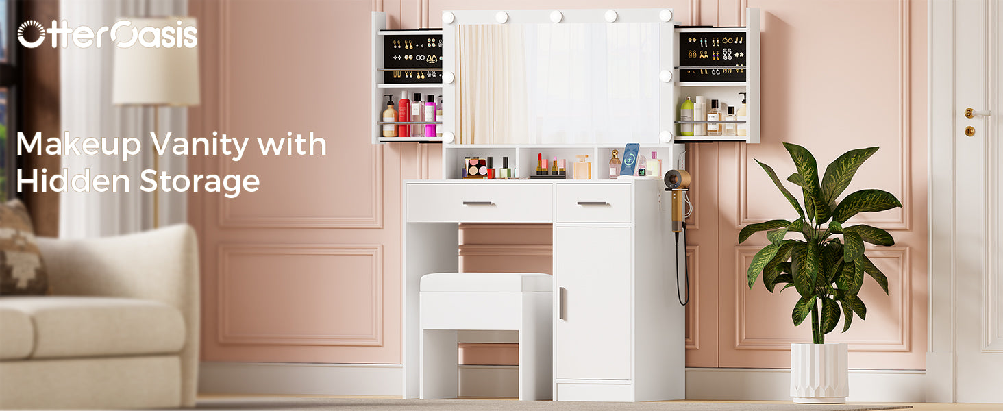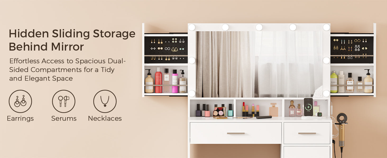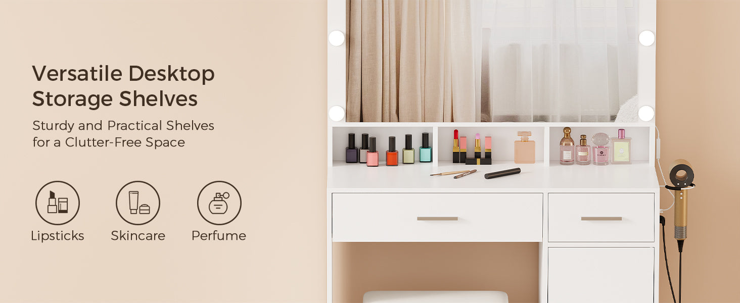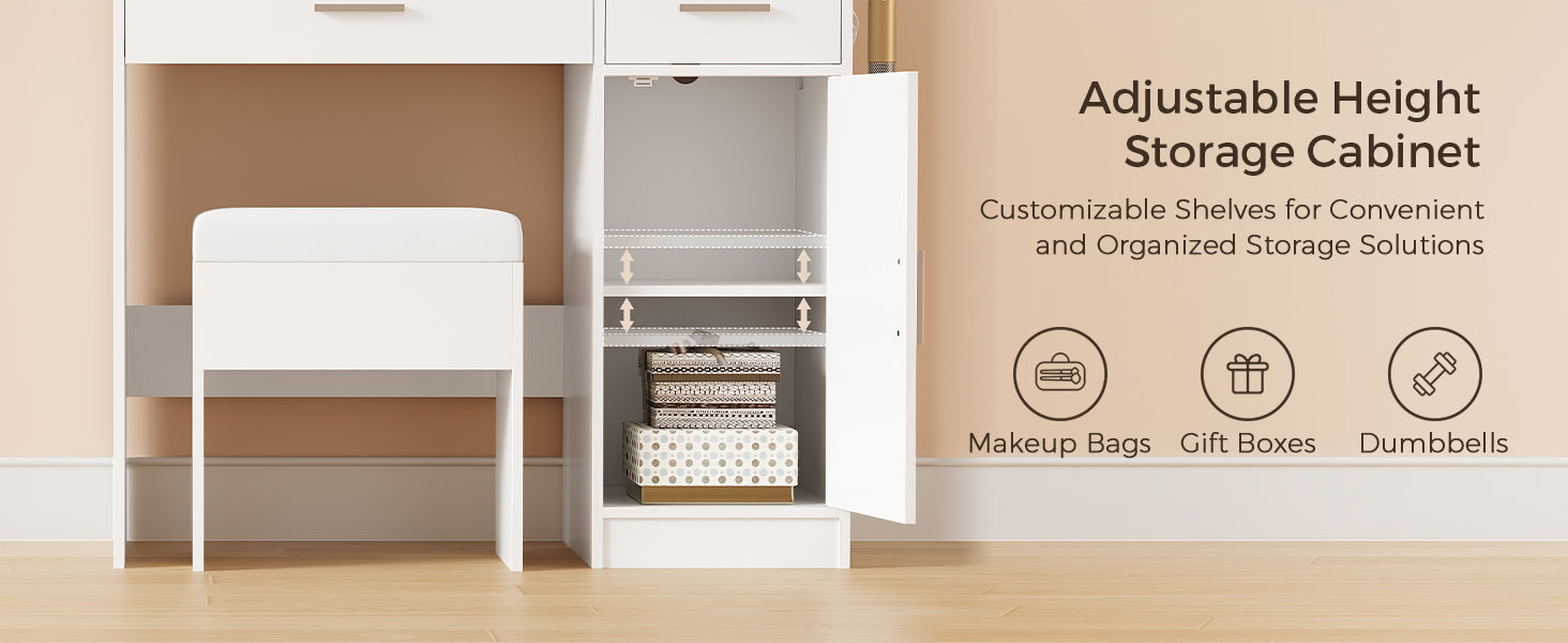 - Ample Storage for Your Essentials: Stay organized with this makeup vanity desk’s spacious storage solutions. It features a wide desktop shelf, hidden compartments behind the mirror, two drawers, and a height-adjustable cabinet. A built-in blow dryer holder and hidden storage in the padded stool add convenience, making this vanity both stylish and functional