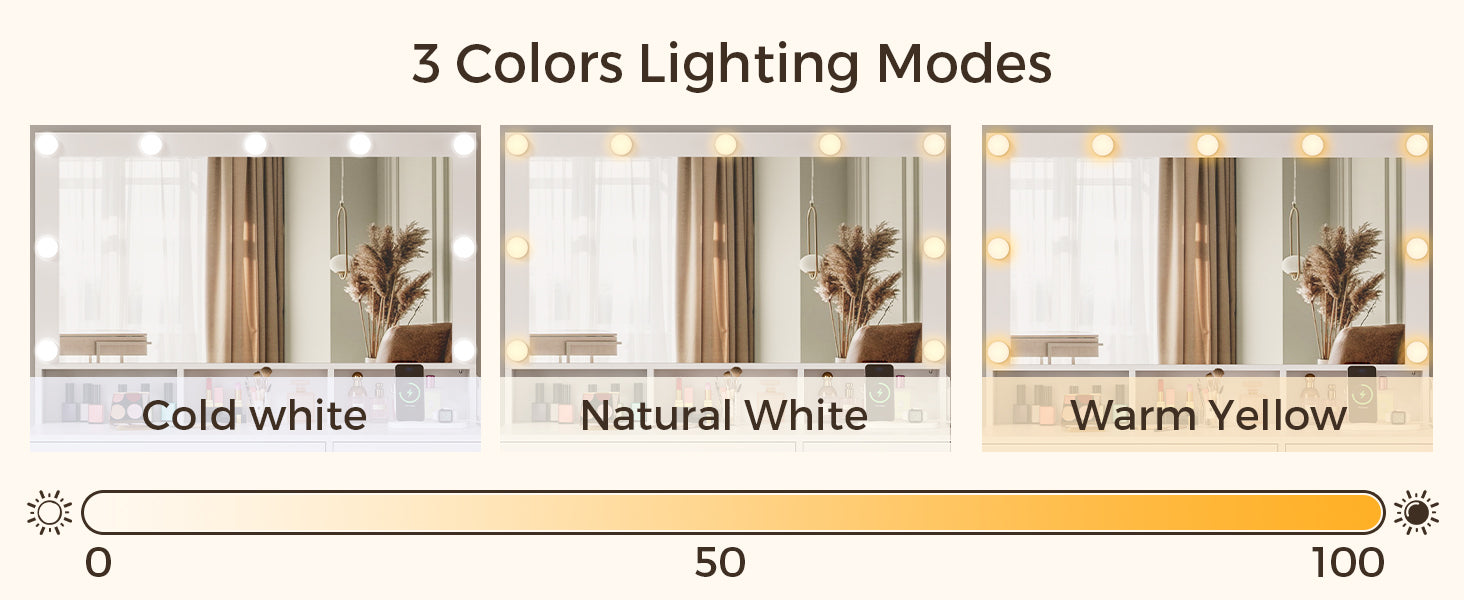 - Complete Vanity Experience with Stylish Mirror & Lights: Transform your beauty routine with this elegant vanity desk featuring a lighted mirror. With three adjustable light modes, this makeup vanity ensures the perfect lighting for every occasion, whether you’re starting your day or preparing for a special night out. Its sleek white design adds a touch of sophistication to any room while offering practicality and charm