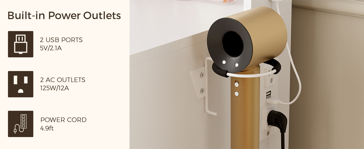- Convenient Built-in Outlet: This vanity with chair comes equipped with an integrated outlet, allowing you to conveniently plug in your hairdryers, straighteners, or other beauty tools. No need to search for extra outlets – everything you need is right at your fingertips, making this makeup vanity desk with lights even more practical for everyday use
