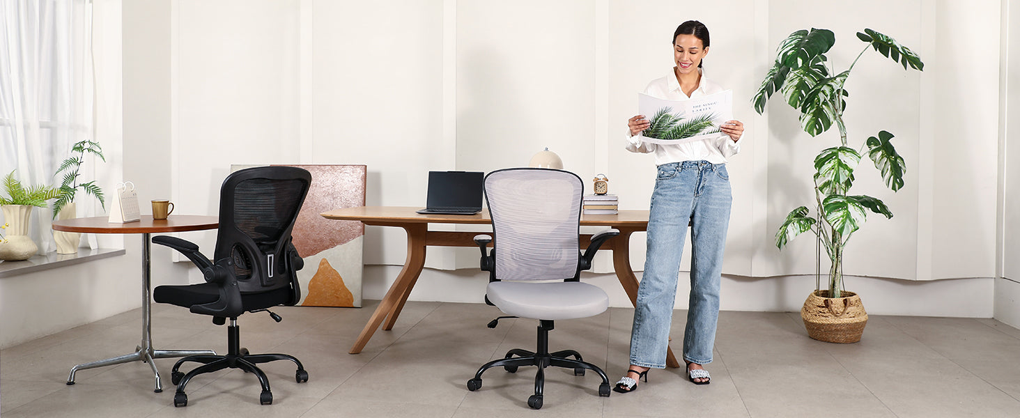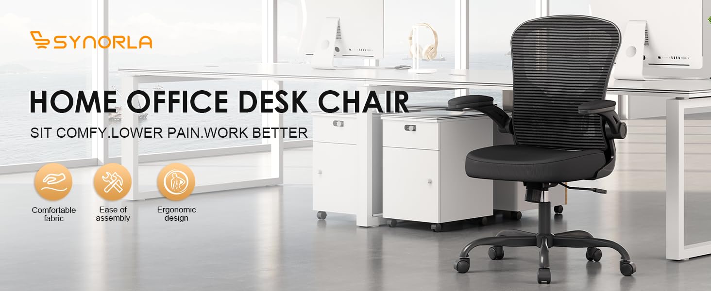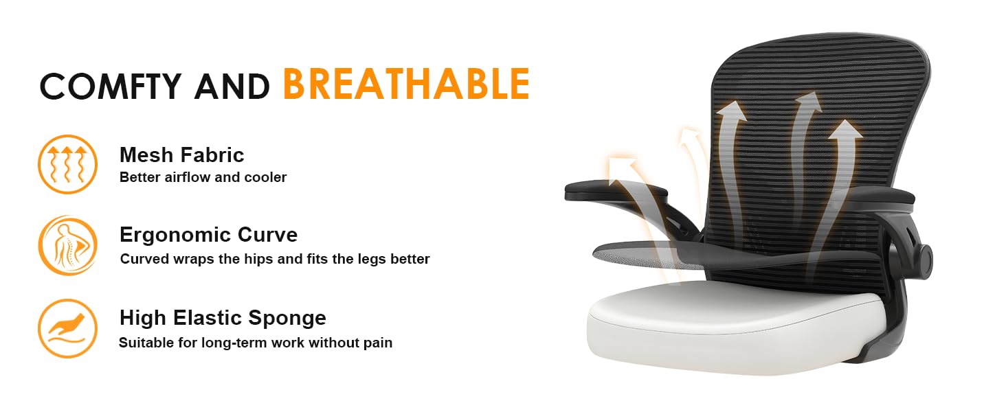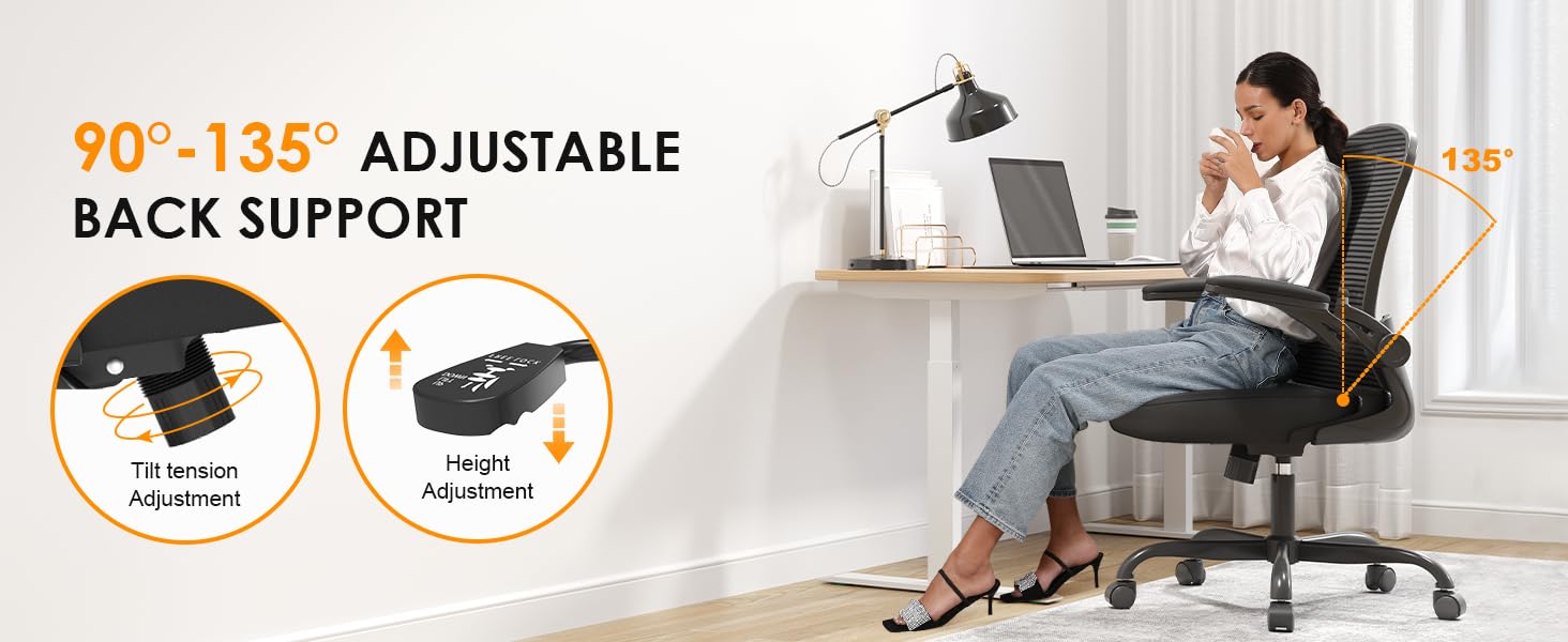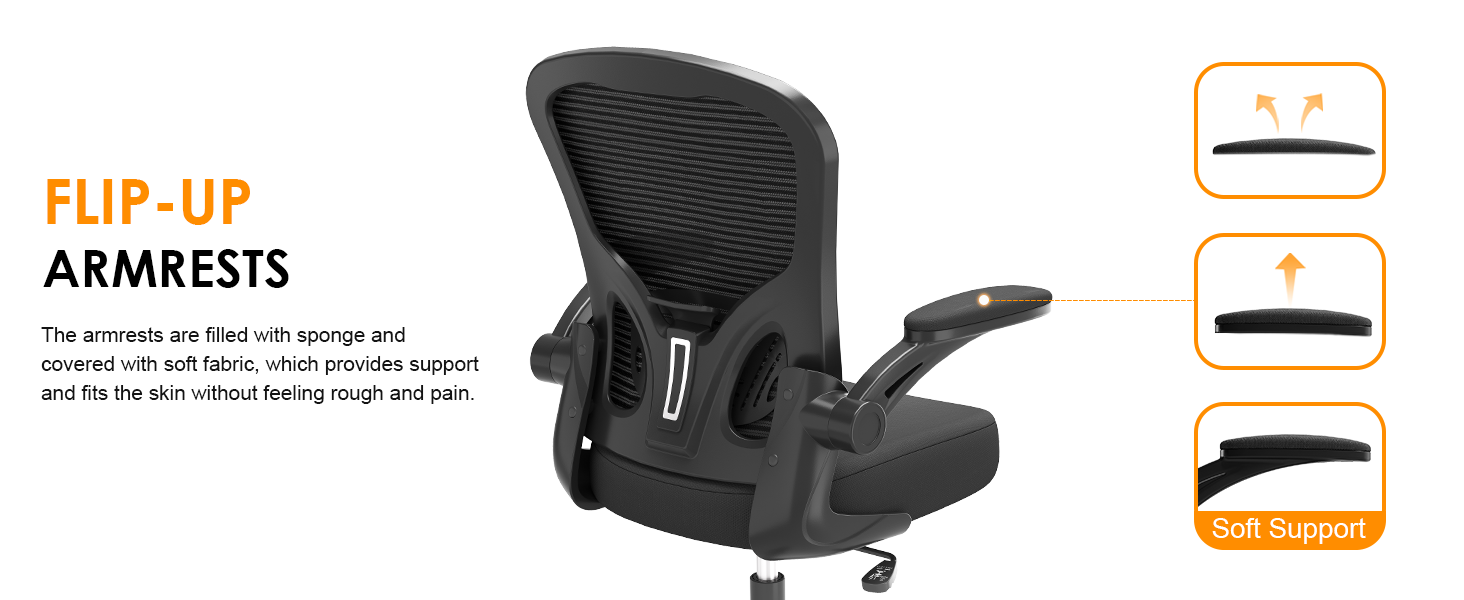 - SPACE-SAVING AND COMFORTABLE: The desk chair features 90°flip-up armrests, making it easy to move the chair underneath the table while not in use, perfect for compact spaces. The armrests are made of high-density foam and elastic mesh, soft and thickly wrapped, providing comfortable cushioning for the arms. The casters of the task chair make it easy to move effortlessly on both hard and carpeted floors
