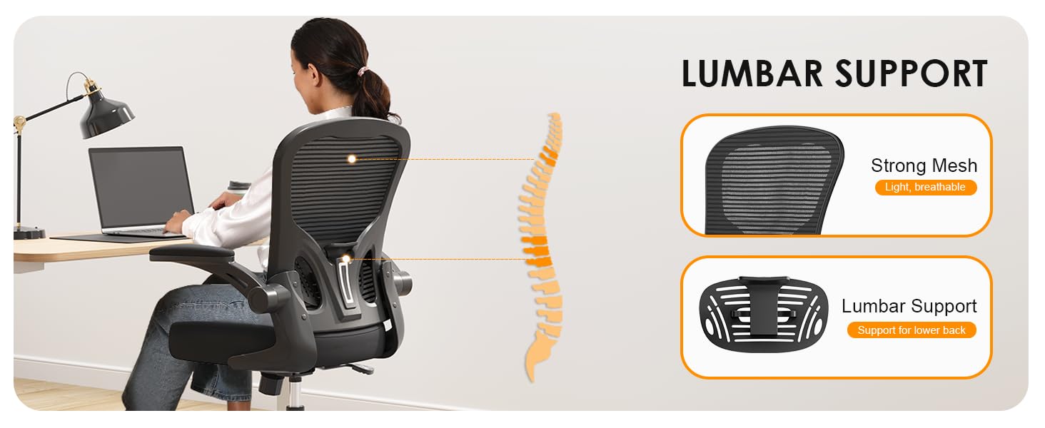 - BREATHABLE MESH AND LUMBAR SUPPORT: The seat’s cushion of the mesh computer chair is made of 3-inch thick high-density foam that stays quite comfortable even after sitting for long hours. The mesh back allows air to flow through which helps you keep cool during the workday, you won't feel stuffy or sweat. Lumbar support is adjustable in 3 heights to accommodate the natural curvature of the spine, relieving back pain when sitting at a desk using a computer all day